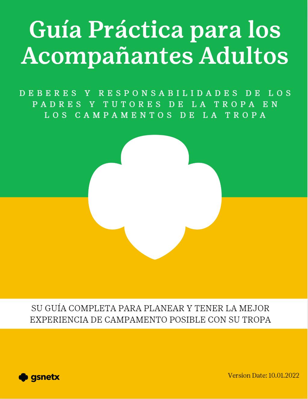 Cada evento de campamento nocturno de GSNETX requiere al menos una mujer adulta con el certificado de Entrenamiento de Campamento de Tropas GSNETX vigente y valido, y al menos una mujer adulta con certificado de Primeros Auxilios y RCP vigente, obtenido de un proveedor aprobado por GSNETX. Los voluntarios masculinos también pueden ser voluntarios certificados en primeros auxilios y capacitados en campamentos de tropas GSNETX, sin embargo, dado que los hombres no pueden dormir en la misma área que las niñas, no pueden ser los únicos voluntarios con certificados de capacitación en campamentos de tropas o de primeros auxilios en un campamento nocturno. A menudo, se invitará a más adultos de la tropa a venir al campamento para cumplir con el aumento de la proporción de seguridad consciente entre adultos y niñas. Como acompañante adulto, debes confiar en el adulto capacitado en el campamento de tropa GSNETX y en la persona capacita en primeros auxilios de tu tropa para obtener orientación y las políticas.
