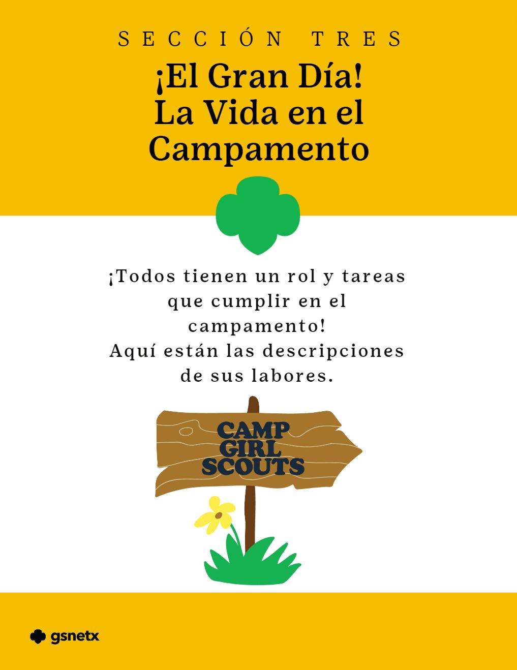 Los campamentos de tropas requieren mucha coordinación y planeación con la finalidad de crear una experiencia segura, educativa y divertida para todos. El Programa de Girl Scouts promete grandes resultados de liderazgo al aire libre para las niñas, y es nuestra función comprender cómo se logra esto y cómo apoyarlo, no solo para nuestra hija, sino para cada niña presente en el campamento. Tenemos un papel fundamental que desempeñar. Para hacer esto, necesitamos que todos los voluntarios adultos comprendan cuáles son los objetivos del campamento y las tareas específicas que pueden realizar cada uno de ellos para garantizar el éxito del campamento.