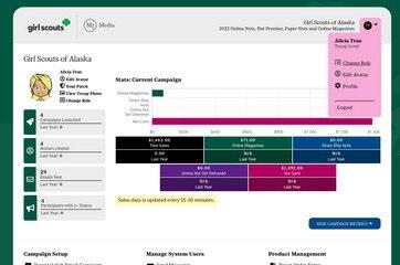 Plataforma online de M2 Media para niñas y gerentes de productos de otoño de la tropa, para llevar un seguimiento y manejar las ventas online.