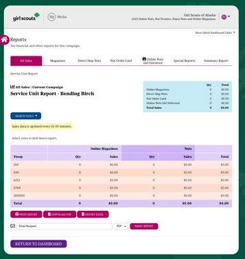 Para verificar los pagos, haga clic en Reports y después seleccione la pestaña Special Reports. El primer informe que deberá leer es el Informe Resumido de Girl Scout. Todos los informes están en Excel.