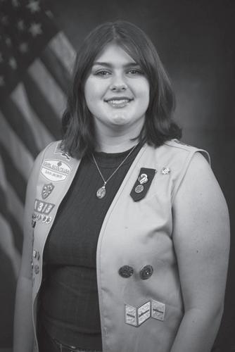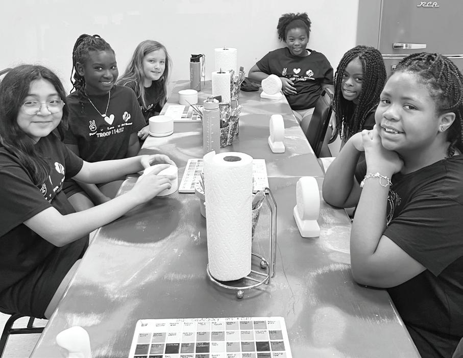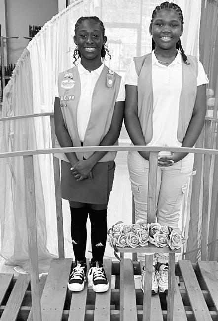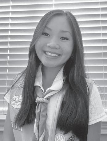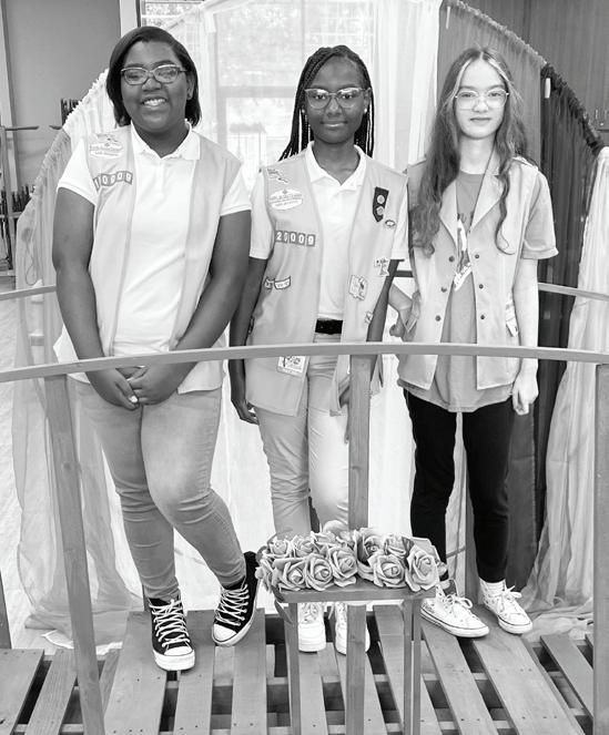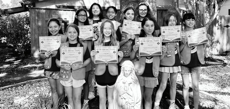 Troop 149064 earned their Bronze award for their Mary Prayer Garden project at St, Cyril of Alexandria Catholic Church. They clean up the area, plant flowers, landscape, and install the Mary statue and new benches. They also built a Little Library that they stocked with donated books, handmade rosaries, and handmade prayer cards. After the project was finished, they revealed it and held their bridging ceremony from Juniors to Cadettes. See more Scrapbook photos on page 40.