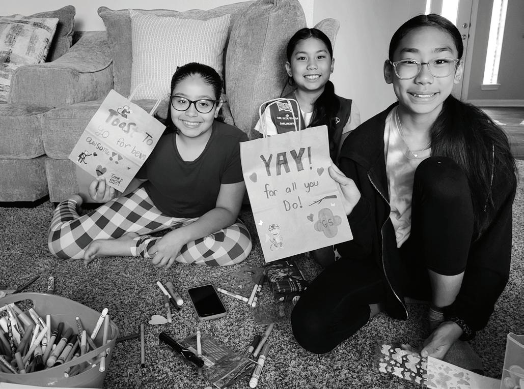 Linda and Maia from Troop 111139 and Zoe from Troop 111029 decorated thank you bags for cookie donations to the NICU nurses at Memorial Hermann's Children Medical Center. The girls wanted to give back to the nurses that took care of Linda's triplet siblings during their stay in the NICU.