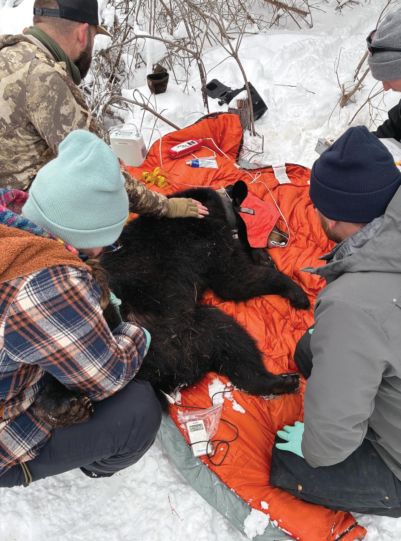 Below: The research team taking measurements, checking on the health of the bear and repairing a transmitter used to track his movement.