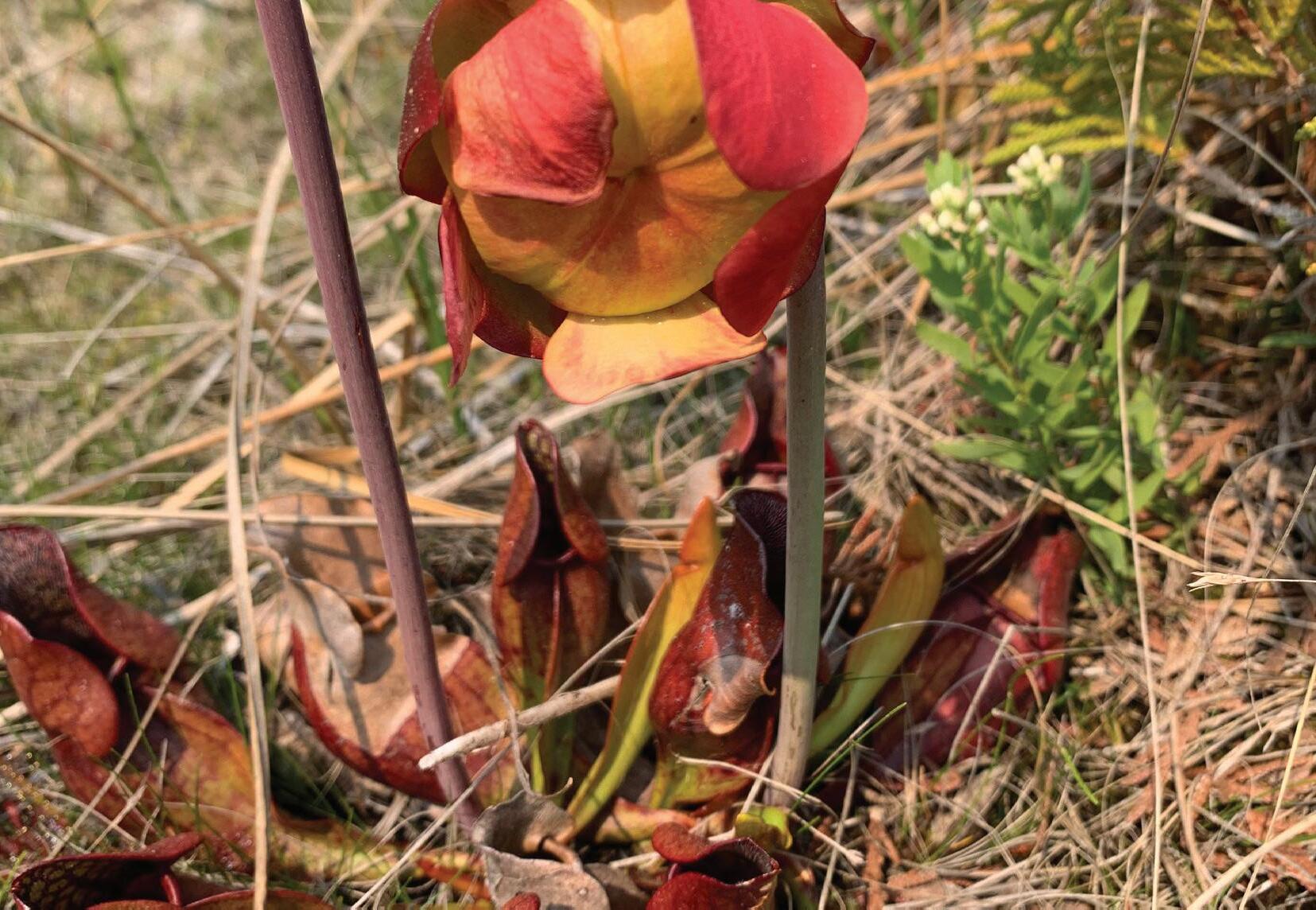 Upper Manistee Headwaters: The Milock Family Preserve | Plants 56 PHOTO: NATE RICHARDSON Pitcher Plant (Sarracenia purpurea) Featured Wetland Type: Bog Other Wetland Types: Muskeg, Poor Conifer Swamp, Poor Fen Best Season: Spring-Fall C Value: 10 Although pitcher plants are a diverse group, this is the only member of the family in Michigan. This fascinating species has deep maroon-colored petals on blooms that stick out above its modified leaf structures. The leaves form “pitchers” that trap insects, providing additional nutrients and minerals that are often lacking in the nutrient-poor habitats where it thrives. Fun Fact: Considered among the most ravenous plants, this unique species is capable of trapping thousands of insects. Sarracenia purpurea lacks a hood, which allows rainwater to enter its “pitcher” and insects are killed by drowning in water. As the water dries out the insects are digested by the leaves of the plant.