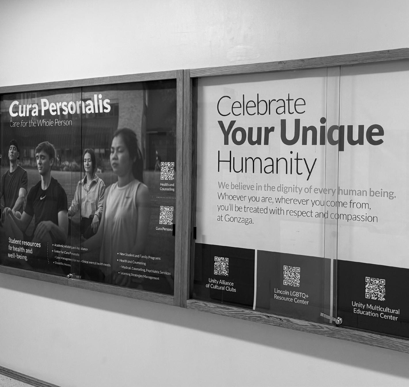 The exterior of College Hall, a central symbol of Gonzaga’s Jesuit mission and values. Inside, posters emphasize Cura Personalis and universal respect—messages contradicting student experiences. Gonzaga preaches belonging. Not our experience.