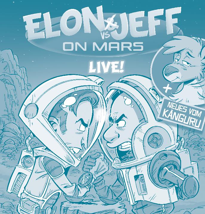 Marc-Uwe Kling: „Worum gehts? Die beiden superfiktiven Multimilliardäre Elon Tusk, Chef des Automobilherstellers Edison, und Jeff Jezos, Gründer von The Shop, dem weltweit größten Versandhändler, liefern sich ein Wettrennen zum Musk. Sorry, ich meine natürlich zum Mars. Ein Schelm, wer Bezos dabei denkt. Einmal angekommen, erbringen die beiden den Beweis, dass ein Planet nur zwei Bewohner braucht, damit diese sich in Nachbarschaftsstreitigkeiten verwickeln. Ob ein Maschendrahtzaun die Lösung ist? Überdies ist auch Zeichner Bernd Kissel am Start und wird mit dem Publikum einen neuen Känguru-Comic entwickeln. Crazy Konzept.“