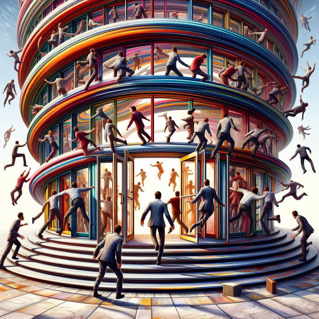 Así nos tuvo Nelson varios días llenándonos unos minutos de la tarde con sus anécdotas de por la mañana ante la puerta giratoria. Una tarde, en un aparte con Ofelia, le dijo que pensaba meterse él mismo por la puerta giratoria y saber lo que pasaba. Ofelia le dijo que estaba loco, que todo eran imaginaciones suyas y que, si se atrevía a cruzar la puerta, el ujier que le había echado semanas antes acabaría sacándole a empujones.