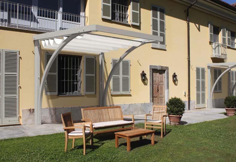 La pergola addossata Volo è dedicata agli spazi esterni che richiedono grande versatilità. Grazie al particolare design della struttura, non vi sono supporti a terra che ingombrano lo spazio e con la tenda a movimentazione manuale è possibile creare zone soleggiate od ombreg-