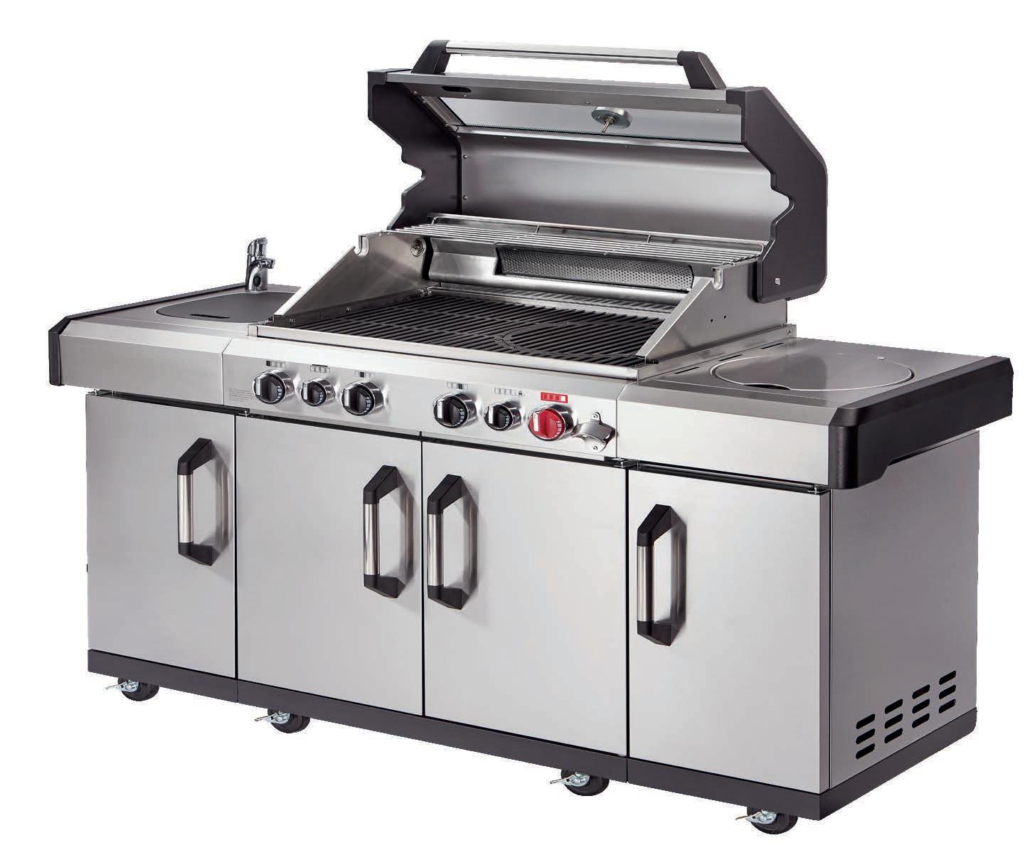 4 bruciatori in acciaio inox, griglia in ghisa smaltata, bruciatore posteriore a infrarossi, termometro, + lavandino integrato laterale + fornello laterale dim 153x64 h118 cm - griglia 70x45 cm