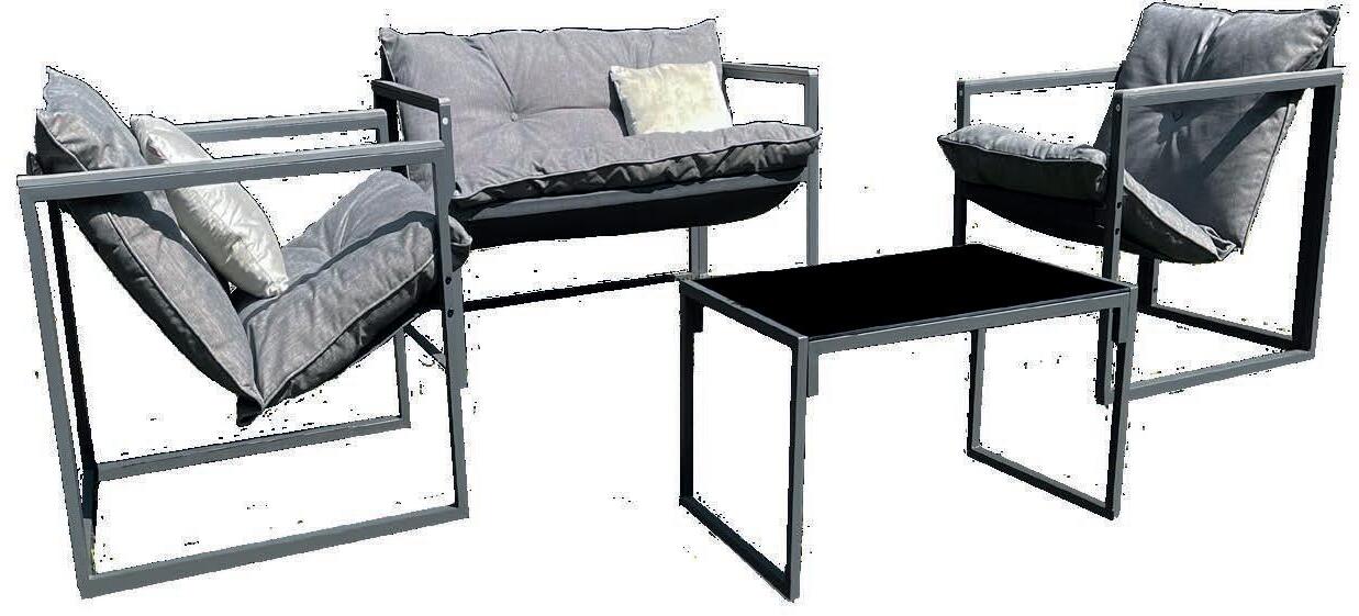 set in acciaio e textilene composto da: divanetto 2 posti 2 poltrone, tavolino con vetro temperato nero