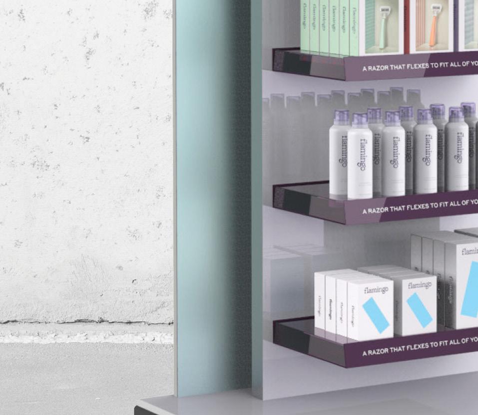 Harry’s wanted to introduce and drive sales for Flamingo, its women’s hair removal product line, in Target stores. The goal was to effectively capture brand identity and showcase the entire product line in an elegant and high-end fashion. This semipermanent endcap display features a complete product mix with a branded header and floating metal shelves that complement Flamingo’s sleek look and high quality. It was engineered to support the required product weight, while maintaining aesthetic appeal and allowing easy assembly in-store. Overall, this display contributed to a successful launch and was effective in highlighting, organizing, and merchandising featured products.