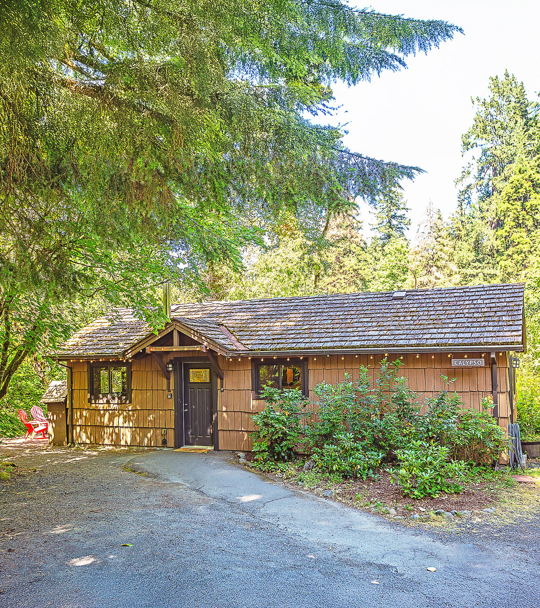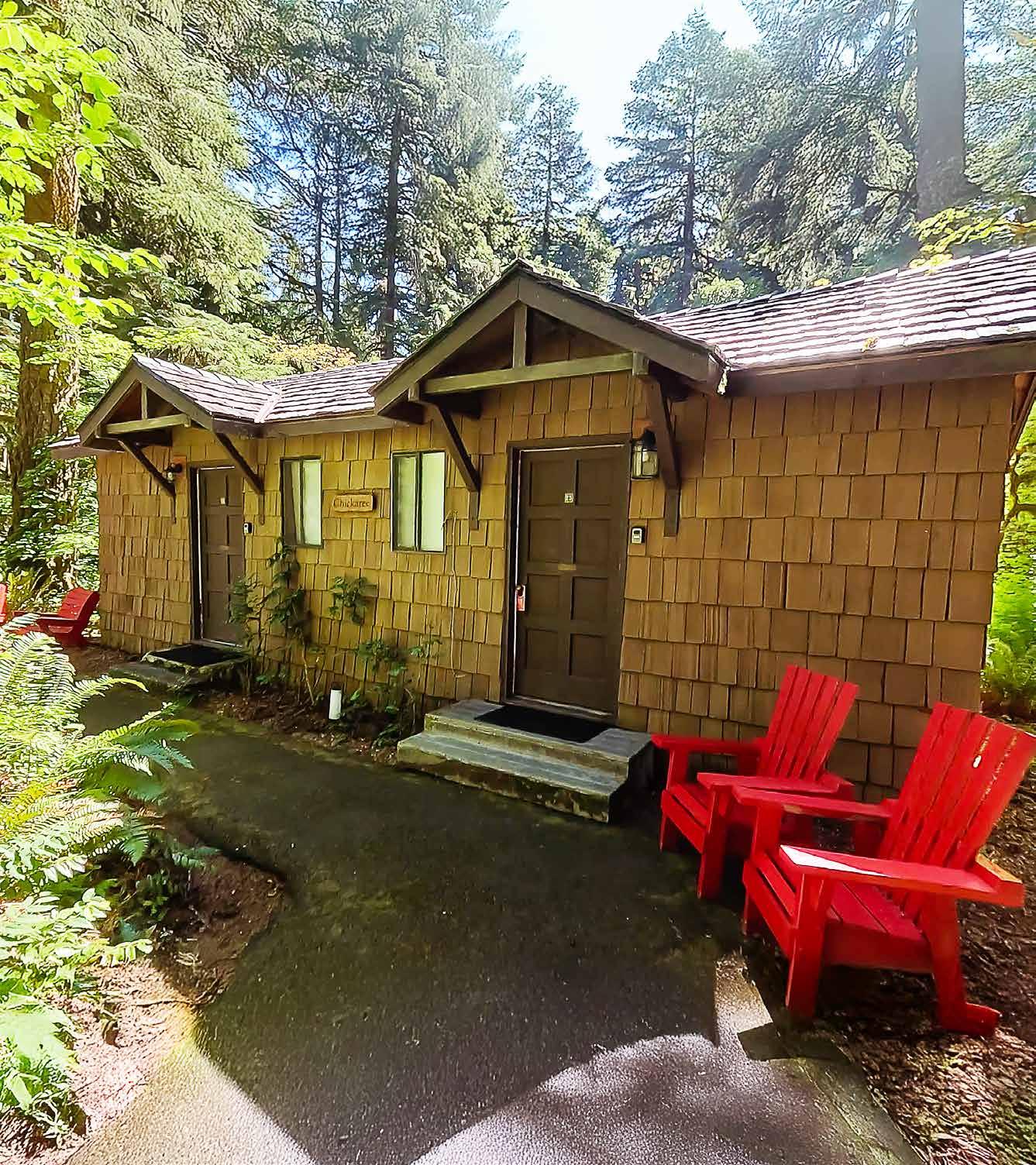 The Alder Cabin has ramp access, a roll in shower with chair, and an accessible parking space near the cabin