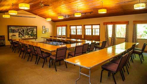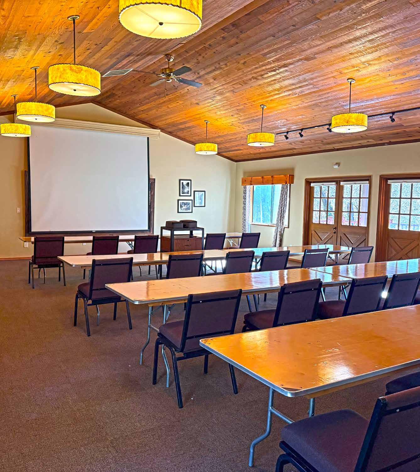 We have a meeting hall here in the Smith Creek Village that could be perfect to host your event. The meeting hall has a front and back patio. There is a wood accent wall, a mural of a Smith Creek bridge, sixteen rectangular 8-foot banquet tables and 85 padded chairs in the meeting hall that you are welcome to set up at the beginning of your event to your chosen layout. (There is an additional fee for our staff to assist with set-up of our tables or chairs within the Meeting Hall or Meadows). Featuring 2 multi-stalled restrooms within the hall and a projector that you are welcome to add on for only $25, provided that you have your own IT person.