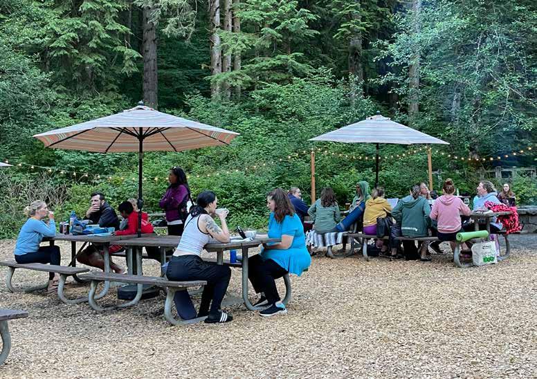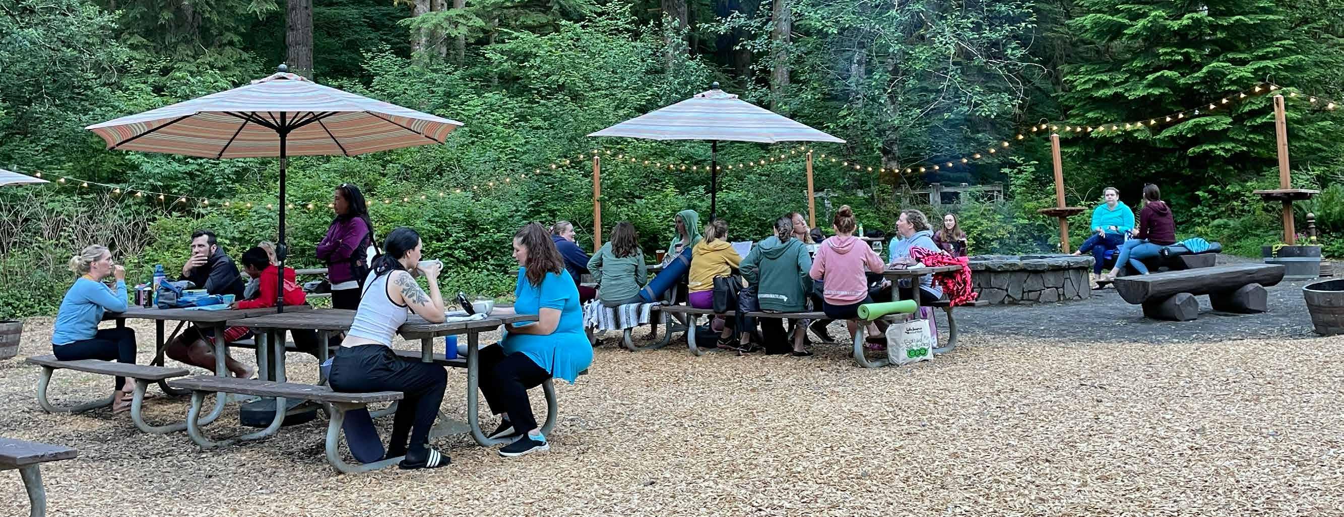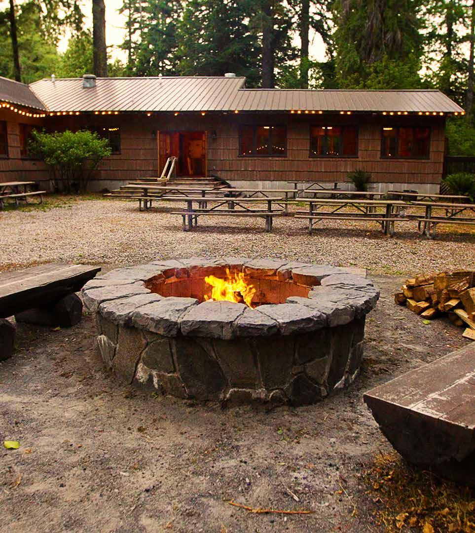Celebrate your event with those nearest and dearest to you in our outdoor courtyard behind our Bigleaf Market & Grill, here in the Smith Creek Village! Surrounded by trees and some romantic string lights, this courtyard is right next to Smith Creek and our Smith Creek Meeting Hall. The courtyard is complete with 12 picnic tables, and a stone firepit with benches for a bonfire (Wood is provided; Fire season restrictions do apply). Multi-stalled Public Restrooms available at front left of the Bigleaf Market & Grill.