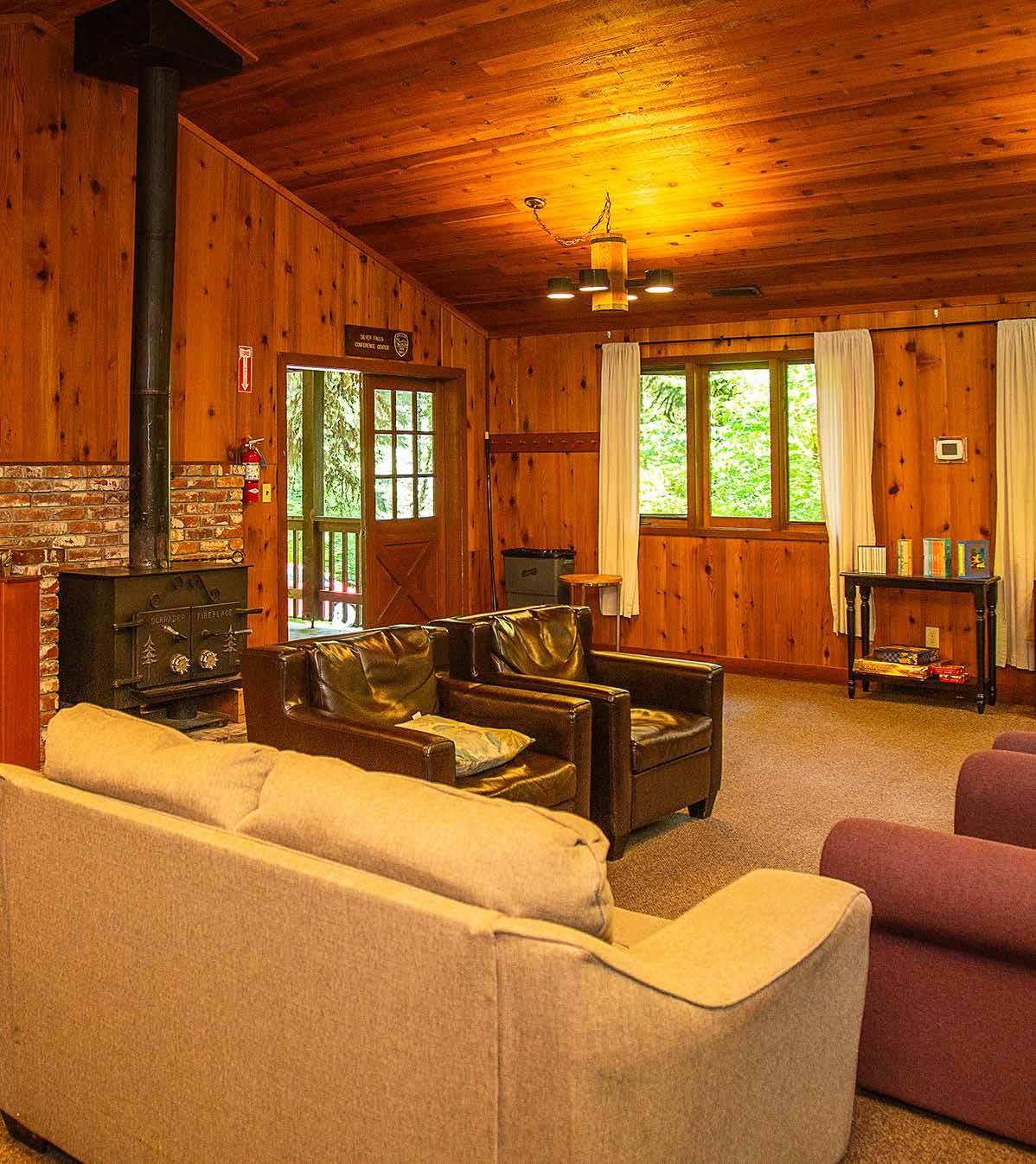 This meeting hall has an occupancy of 30. It was originally built in the 1930’s as a Girl Scout camp, with the surrounding 8 tiny cabins. We can have the number of chairs for your party within the meeting space. There is a refrigerator within the space, plus there are 2 multi-stalled restrooms, with a shower in each outside the hall doors.