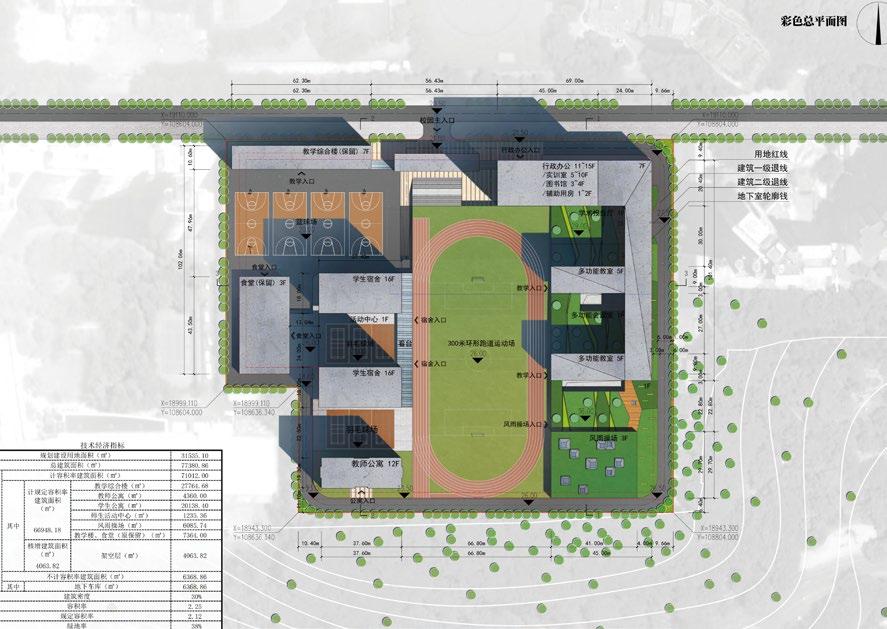 The base is naturally divided into three functional areas by the sports field. The new teaching area and the reserved teaching building together semi-enclose the sports area and the living area. The entrance square and the sports area are in the middle. service area for life. Compared with the centralized layout of teaching and living functions, the super-large building capacity has been weakened, and it is more closely related to the reserved buildings. The cramped campus entrance has been changed, and the dynamic and static divisions are clearer without interfering with each other. atmosphere