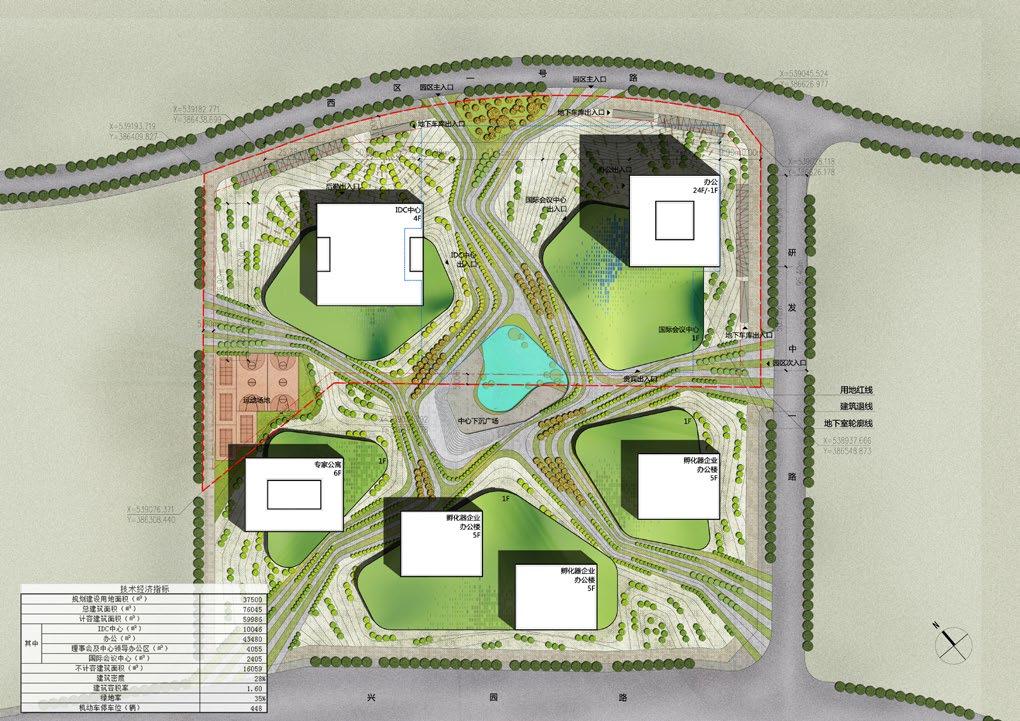 彩色总平面图 1:1200 犹如云技术应用中广泛从网络接入的使用模式一般, 自然延伸,与低密度建筑之间发生激烈的碰撞;建筑布局 生态策略1 我们在不同功能区域有策略的植入一系列绿色开放空间:塔楼切口处 的口袋水花园、裙房二层屋面的山形坡地景观与地面带状生态纽带及 中心修复湿地。绿地嵌入建筑,自然生动的形式与人工化建筑的硬质 边界形成强烈对比,视觉上旗帜鲜明的表达了我们对建筑的生态城市 主义主张。 建筑策略3 建筑功能分析图1 理事会及中心领导办公区 计算所中心 遥感飞机停机坪/卫星接收站 遥感中心 员工休闲中心 软件所中心 电子所中心 信媒体中心 自动化中心 大堂门厅 职工活动中心与地下室 中心湿地 职工活动中心 职工活动中心 国际会议中心 员工休闲平台 办公塔楼门厅大堂 地下室 办公主塔楼各楼层包括遥感、自动化、信媒体、电子所、软件所、计算所等办公功能,塔 楼顶部三层为理事会及中心领导办公区,其中包括两层办公空间与一层高级会所。地下空 间设置地下车库外,还结合半地下空间,将职工活动中心、职工食堂与下沉的中心湿地相 结合,打破枯燥的地下空间环境。 洽谈室 参观流线 洽谈室 会议室 机房 VIP接待室 1500坐席 类型1 类型2 类型2 国际会议中心 塔楼办公区 咖啡区 展览区 休息区 类型3 类型4 类型3 建筑功能分析图2 国际会议中心设于主塔楼一层裙房内,可满足1500人会议需求,大会议厅 亦可进行划分隔断,满足不同需求;会议中心既与办公楼紧密相连,又适 当用休息厅、咖啡厅等公共功能与办公功能相连。 IDC中心机房设置简洁宽敞的高品质机房外,我们还为寻求专业化服务的 客户提供VIP会客室与洽谈室,在舒适宜人的环境中以最直观的方式向客 户展示严谨的工作态度与专业的技术性能。 洽谈室 参观流线 洽谈室 会议室 机房 VIP接待室 1500坐席 类型1 类型2 类型2 国际会议中心 塔楼办公区 咖啡区 展览区 休息区 类型3 类型4 类型3 建筑功能分析图2 国际会议中心设于主塔楼一层裙房内,可满足1500人会议需求,大会议厅 亦可进行划分隔断,满足不同需求;会议中心既与办公楼紧密相连,又适 当用休息厅、咖啡厅等公共功能与办公功能相连。 IDC中心机房设置简洁宽敞的高品质机房外,我们还为寻求专业化服务的 客户提供VIP会客室与洽谈室,在舒适宜人的环境中以最直观的方式向客 户展示严谨的工作态度与专业的技术性能。 核心筒电梯系统分高低两区停靠,并设高层领导直达电梯。 建筑功能分析图3 低区电梯 高区电梯 领导直达电梯 建筑策略2 以此为契机,我们在办公主塔楼高区开设成角度建筑切口 继而以斜面切口为母题,在主塔楼与IDC中心建筑不同高度、 不同朝向投射出一系列成角度体量 从而产生吸引人们前往的公共建筑空间 基地远景拥有东南向开阔松山湖湖景资源,同 时由规划结构所产生的内部大面积生态园景亦 建筑策略2 以此为契机,我们在办公主塔楼高区开设成角度建筑切口 继而以斜面切口为母题,在主塔楼与IDC中心建筑不同高度、 不同朝向投射出一系列成角度体量 从而产生吸引人们前往的公共建筑空间 基地远景拥有东南向开阔松山湖湖景资源,同 时由规划结构所产生的内部大面积生态园景亦 建筑策略2 基地 基地 以此为契机,我们在办公主塔楼高区开设成角度建筑切口 继而以斜面切口为母题,在主塔楼与IDC中心建筑不同高度、 不同朝向投射出一系列成角度体量 从而产生吸引人们前往的公共建筑空间 基地远景拥有东南向开阔松山湖湖景资源,同 时由规划结构所产生的内部大面积生态园景亦 引人注目。 规划策略3 人们或分散于各办公区域,或汇集于中心生态湿地公园,或漫游于优美的带状景观之中, 独特的场所感使我们的设计成为一种可见的规划形式,以此诠释出云计算共享、弥漫的特征。 Function analysis and diagram Function analysis and diagram Function analysis and diagram Function analysis and diagram Function analysis and diagram Function analysis and diagram Function analysis and diagram Function analysis and diagram Function analysis and diagram Function analysis and diagram