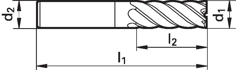 30°/32° helix and roughing and finishing geometry. Suitable for slotting and roughing with large cutting widths and depths in steel, high-alloyed steel and hardened steel up to