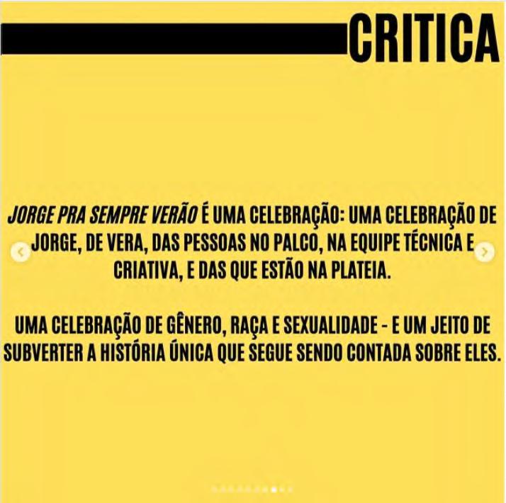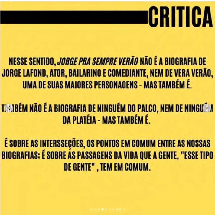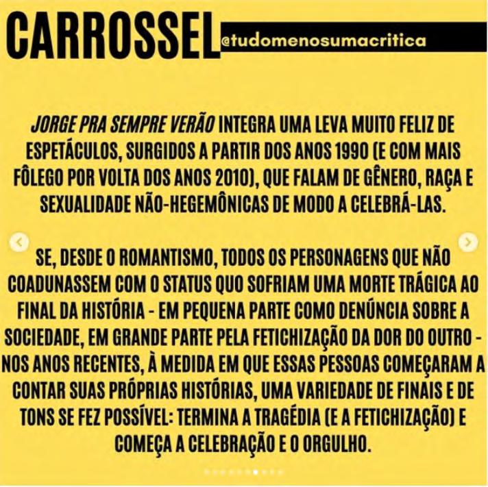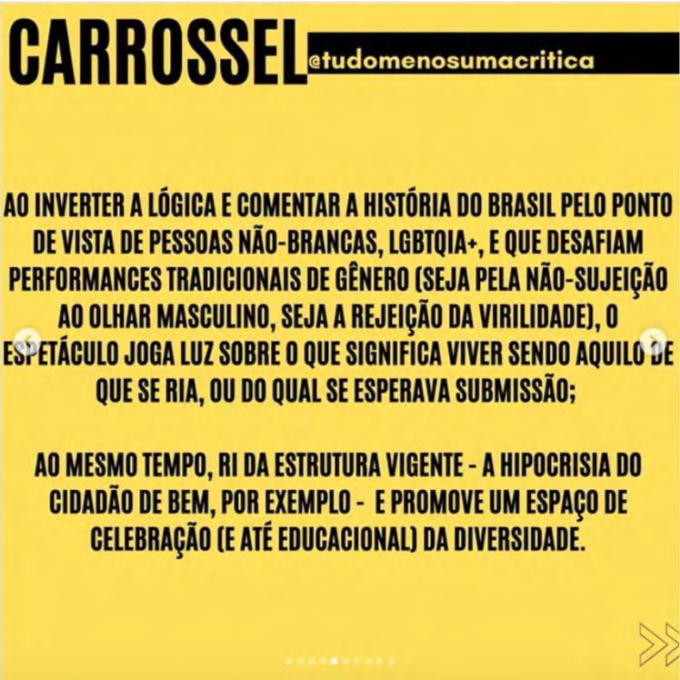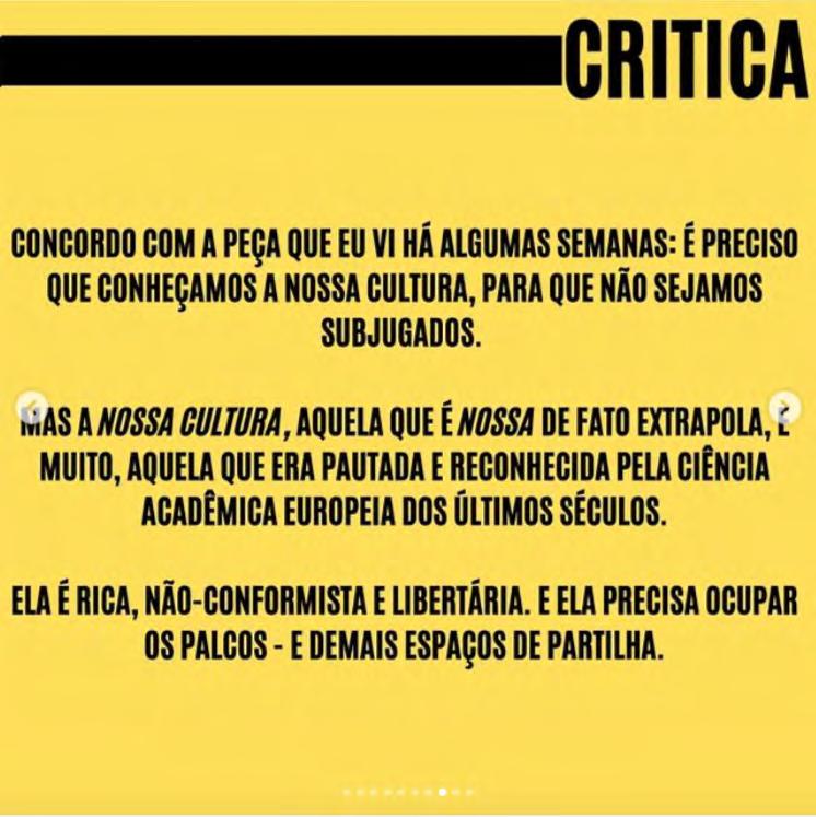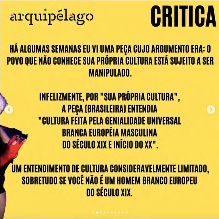 seguirão seus próprios critérios e desejos na escolha das obras que terão críticas publicadas dentro do Projeto Arquipélago. Os textos aqui presentes expressam uma rica diversidade de pontos de vista, formatos, estilos e modos de conceber o exercício crítico. Nesse sentido, a despeito das suas instabilidades estruturais, as críticas teatrais contemporâneas exibem fôlego renovado para pensar a cena, se implicar nos seus movimentos e experimentar possibilidades outras de testemunhar reflexivamente os nossos tempos.
