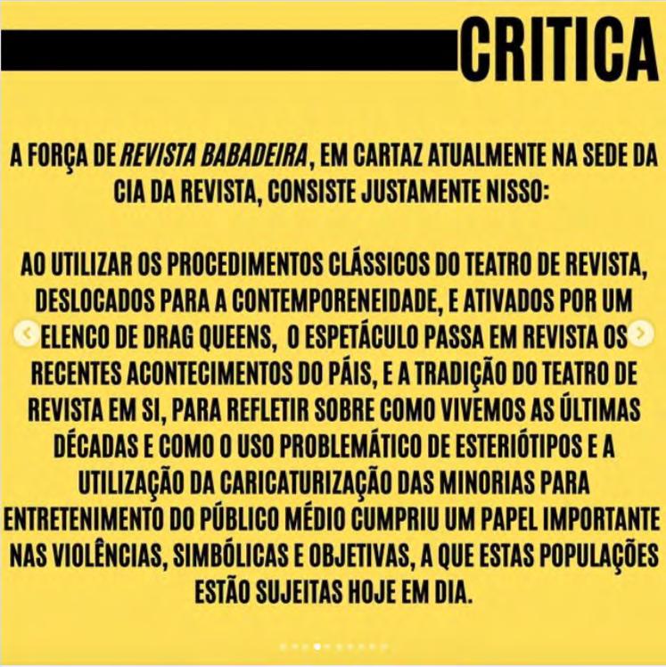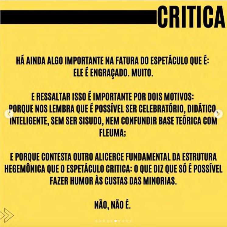 Somos: Cena Aberta, Farofa Crítica! Ruína Acesa, Satisfeita, Yolanda?, Tudo, Menos Uma Crítica e OFF Guia de Teatro.