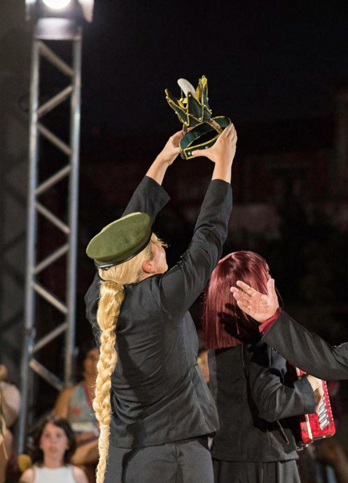 Destaco aqui, o trabalho de atuação de Caju Dantas que interpreta o Rei deposto no início da peça. Um ator jovem contracenando com um dos atores mais experientes da cidade em uma disputa velada pelo trono, interpretando personagens, possivelmente, com idades invertidas. Caju consegue construir a presença do Rei em um momento curto da encenação, com destaque suficiente para que sua queda seja notória como um golpe de Estado e não apenas um assassinato. Em seguida, o ator assume uma sequência de papéis terciários que servem a encenação, mantendo caricaturas singulares para