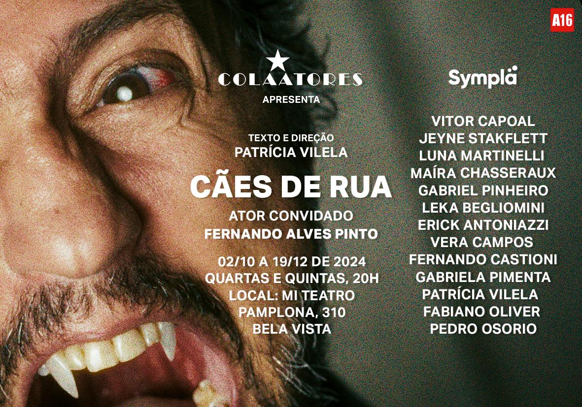 comunicação sobre uma sociedade pouco educada e subserviente. Fake News, negacionismo, QAnon e outras ilusões, são lançadas como restos de alimento a uma sociedade psicologicamente falida, que vaga sem destino, como cães de rua. Texto e direção: Patrícia Vilela. Ator Convidado: Fernando Alves Pinto. Elenco: Vitor Capoal, Jeyne Stakflett, Luna Martinelli, Maíra Chasseraux, Gabriel Pinheiro, Leka Begliomini, Erick Antoniazzi, Vera Campos, Fernando Castioni, Gabriela Pimenta, Fabiano Oliver, Pedro Osorio, Patrícia Vilela. Participação Especial: Marcelo Tas (voz em off). MI Teatro / Restaurante El Mercado Ibérico - R. Pamplona, 310. Bela Vista. Quarta e quinta, 20h. R$80. 90min. 16 anos. Estreia 02/10.