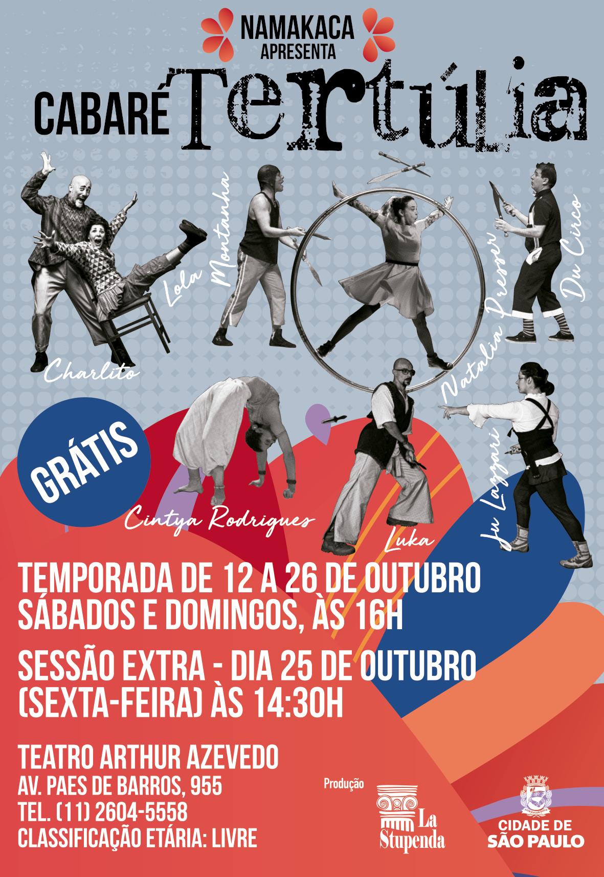 CA peça é um cabaré, no qual dois palhaços chegam com duas malas como se fossem dois viajantes, e convidam os artistas a fazerem seus números. Eles não utilizam falas, usam o corpo de forma lúdica e cômica para interagir com os convidados que passeiam por técnicas como parada de mão, acrobacia, roda Cyr, arremesso de facas, malabarismo e palhaçaria. Com Grupo Namakaca. Roteiro e direção: Natalia Presser e Ronaldo Aguiar. Elenco: Cintya Rodrigues, Du Circo, Ju Lazzari, Luciana Viacava, Luka Ianchity, Montanha Carvalho, Natalia Presser e Ronaldo Aguiar. Teatro Arthur Azevedo - Av. Paes de Barros, 955. Alto da Mooca. T. 11 2604.5558. Sábado e domingo, 16h. Gratuito (retirar ingressos com 1h antes na bilheteria). 60min. Livre. De 12 a 26/10. Dia 25/10, 14h30 (sessão extra para escolas e público em geral).