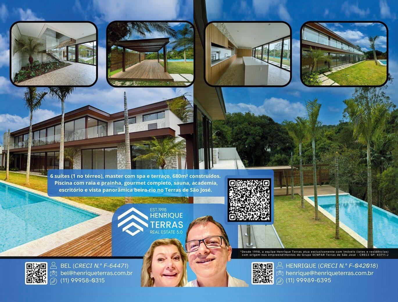 Residência de alto padrão com 6 suítes , sendo uma no térreo e uma master com spa privativo e terraço. São 680m² de área construída, com piscina com raia e prainha, espaço gourmet completo, sauna, academia e escritório, além de uma vista panorâmica deslumbrante à beira do rio, no exclusivo Terras de São José