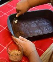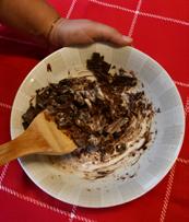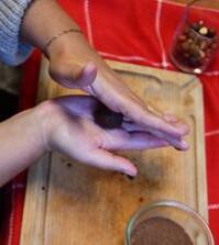 6. Prélève la ganache avec une petite cuillère puis, avec tes mains, forme des petites boules autour des ingrédients mystères et roule-les dans le cacao.