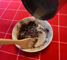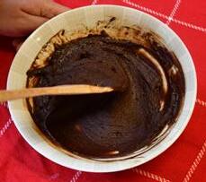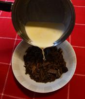 3. Quand la crème commence à frémir, verses-en la moitié sur le chocolat, tout en mélangeant délicatement avec la maryse de manière à éviter que trop d’air n’entre dans la préparation.