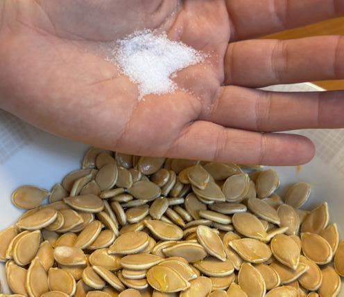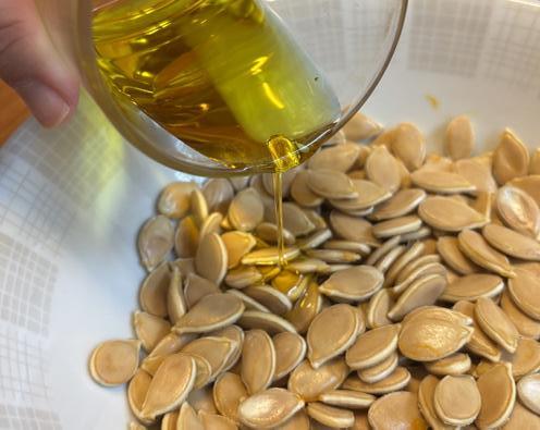 4. Remets les graines dans le bol, et ajoutes-y deux cuillères d’huile, deux bonnes pincées de sel et tes épices. Mélange le tout.