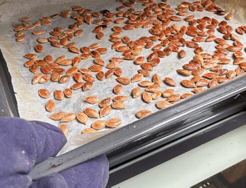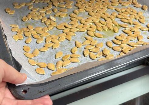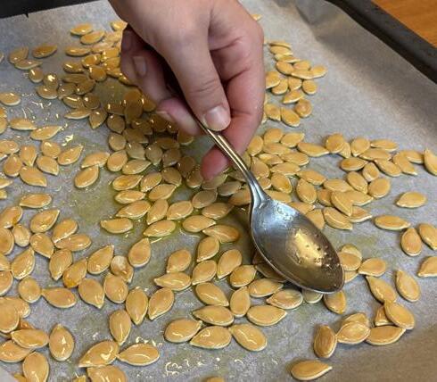 7. Une fois sorties du four, laisse les graines refroidir totalement avant de les consommer, ou mets-les chaudes dans ton bol de soupe.