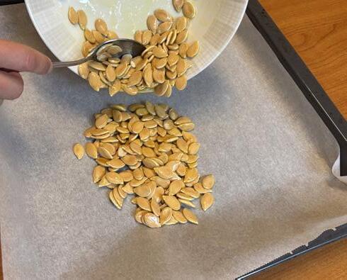 5. Mets le papier cuisson sur la plaque et étale les graines dessus.