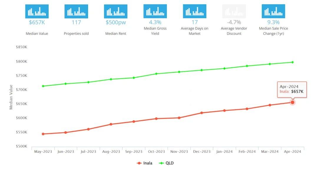 在过去的12个月里,Inala已经卖出了117套独栋房屋,售价中位数为$657K,同比增长9.3%,平均需要17 天即可售出,房东减价为-4.7%。