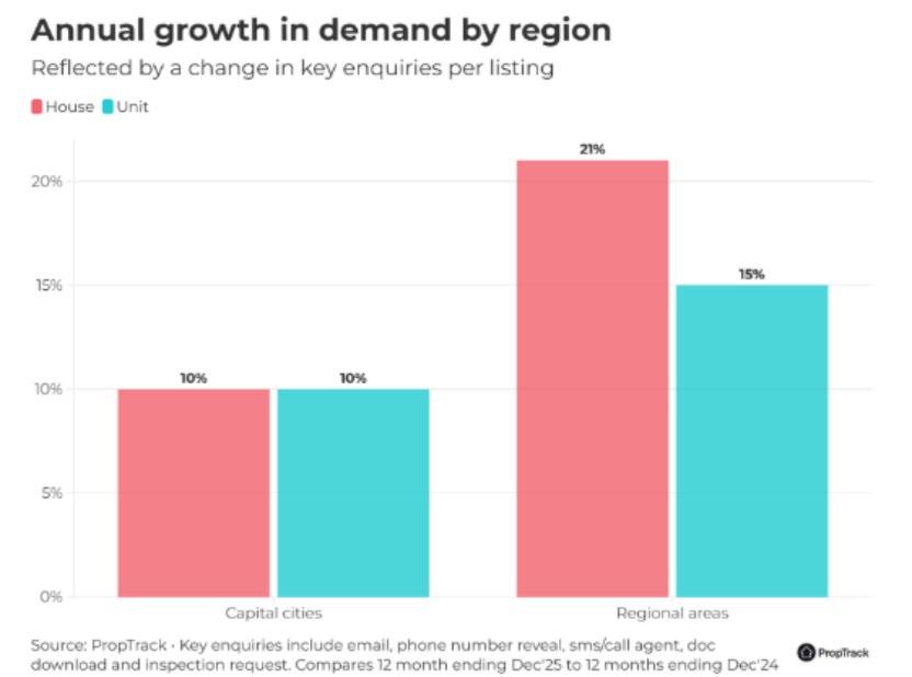 此外,区域区域占据了大首都城市统计区 (GCCSAs)前十名中的七个,住房查询量增长 最大,单位数前十中占六个。不仅整体上买家的询 问量增加,买家的参与也更集中在区域市场。