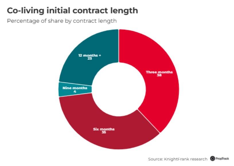 约38%的共居设施租户最初签订为期三个月的初 始合同,35%签约为期六个月。只有四分之一的 租户在刚搬进来时选择12个月或更长时间。