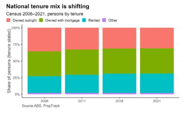 澳大利亚的住房格局正在发生变化。虽然大多数家 庭仍然拥有自己的房屋,无论有没有抵押贷款,但 租赁正在上升。我们正逐步从三期制——全额拥有 房屋、房贷和出租——转向两期制,主导市场要么 是抵押贷款,要么是租赁。