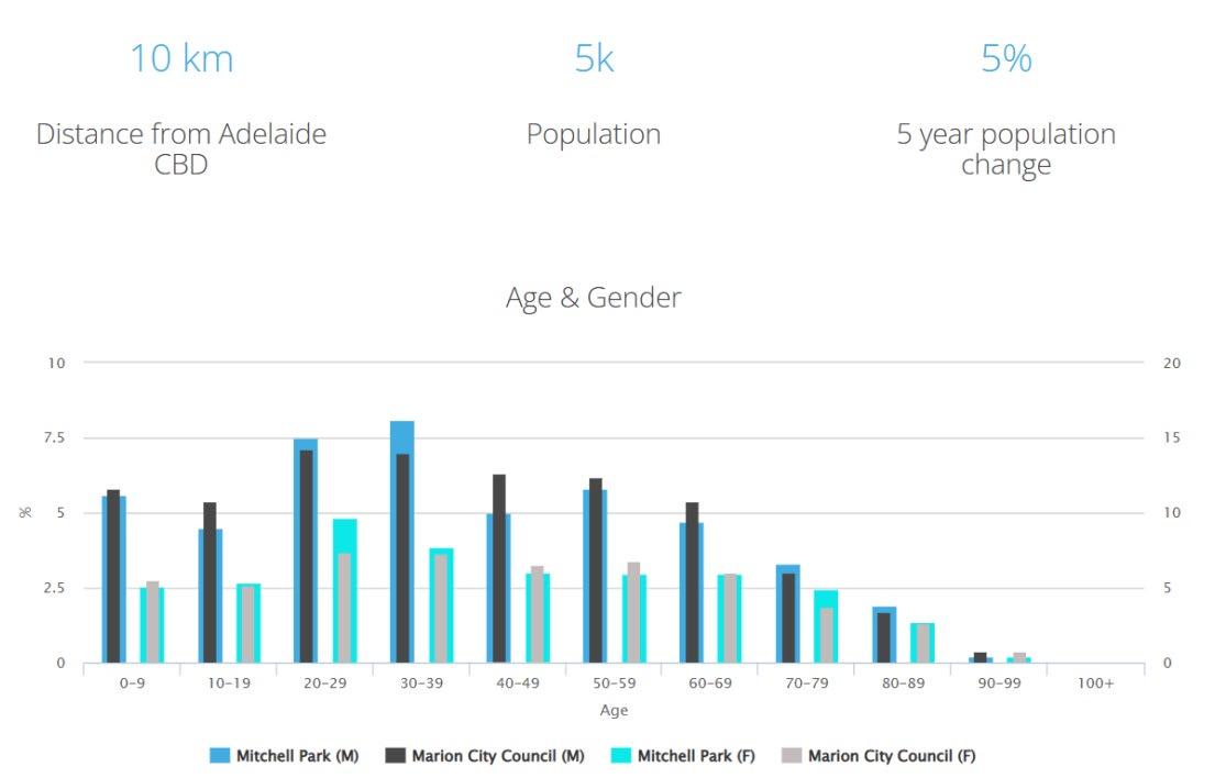 Mitchell Park的大小约为2.1平方公里。2011年Mitchell Park的人口为5206人。到2016年,人口为5747人, 在此期间该地区的人口增长率为5.1%。Mitchell Park的主要年龄组是20-29岁。Mitchell Park的家庭主要是 无子女的夫妇,每月可能偿还1800-2399澳元的抵押贷款还款。一般来说,Mitchell Park的居民从事专业 职业。2011年,Mitchell Park 49.3%的房屋是自有住房,而2016年为47%。(资料来源:澳大利亚统计局)