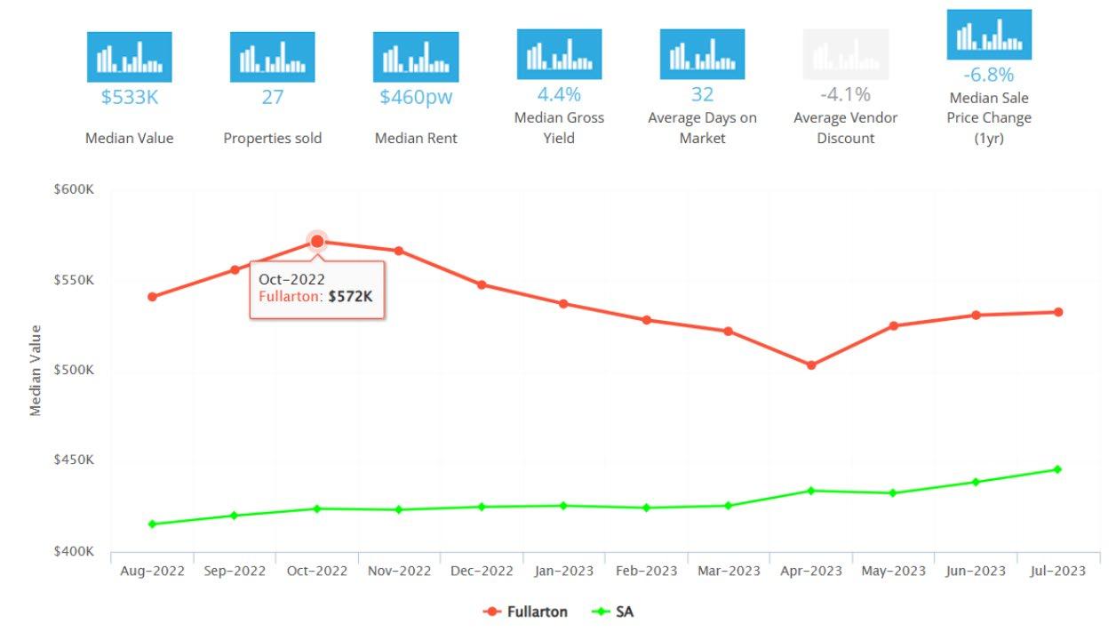 在过去的12个月里,Fullarton已经卖出了27套单元房,售价中位数为$533K,同比降低了6.8%。平均需要 32天即可售出,房东减价为4.1%。