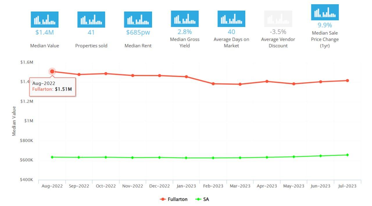 在过去的12个月里,Fullarton已经卖出了41套独栋房屋,售价中位数为$1.4M,同比增长了9.9%。平均需 要40天即可售出,房东减价为3.5%。