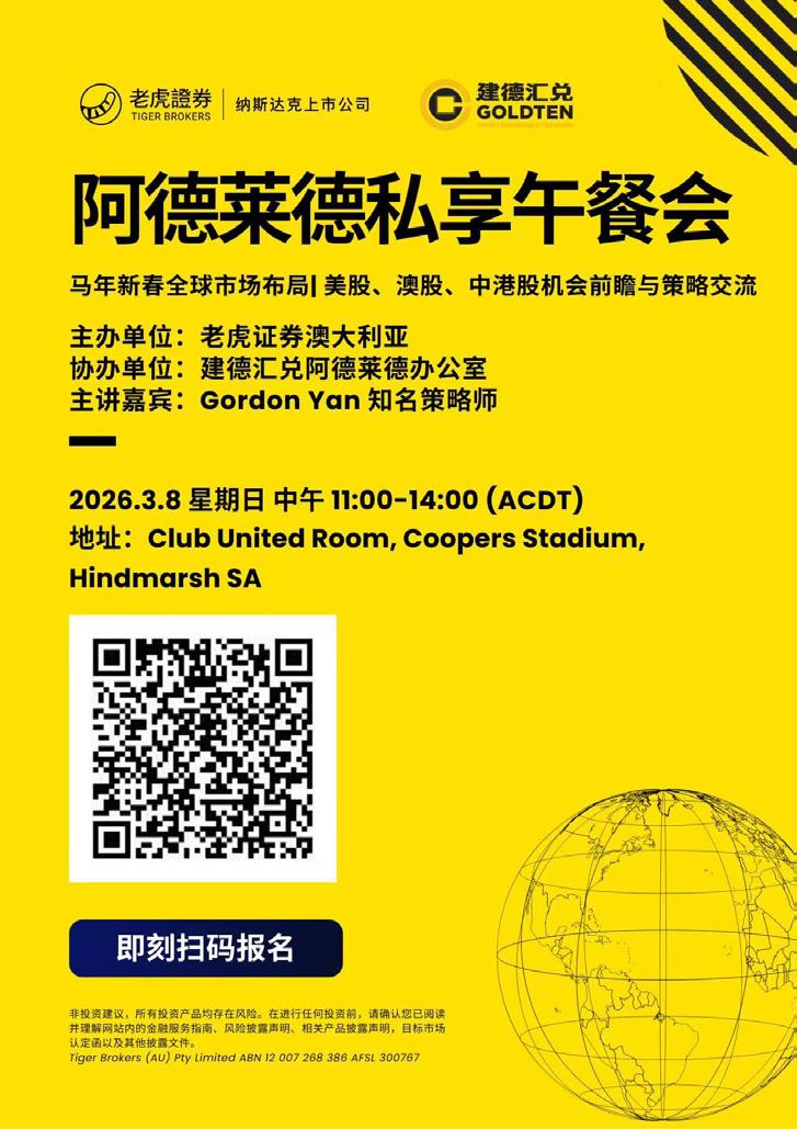 长期以来,跨境证券服务机构的线下活动多集中 于悉尼与墨尔本。此次老虎证券将活动落地阿德 莱德,某种程度上反映出南澳投资群体的成熟与 增长。