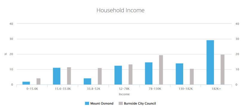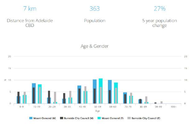 Mount Osmond的大小约为2.1平方公里。2011年Mount Osmond的人口为499人。到2016年,人口为363人,在 此期间该地区的人口下降了27.3%。Mount Osmond的主要年龄组是50-59岁。Mount Osmond的家庭主要是有 子女的夫妇,每月可能偿还1400-1799澳元的抵押贷款还款。一般来说,Mount Osmond的居民从事专业职 业。2011年,Mount Osmond 93.4%的房屋是自有住房,而2016年为94.5%。(资料来源:澳大利亚统计局)