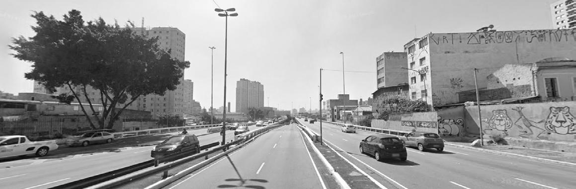 alizado obrigatoriamente por meio do transporte individual motorizado, a vista proporcionada pelo desnível em relação ao entorno não dá indicativo da passagem por uma área tão importante da cidade. Contempla-se uma sucessão de empenas cegas, áreas degradadas, canteiros residuais e espaços ociosos; frutos da desarticulação brutal do entorno proporcionada pela construção da avenida.