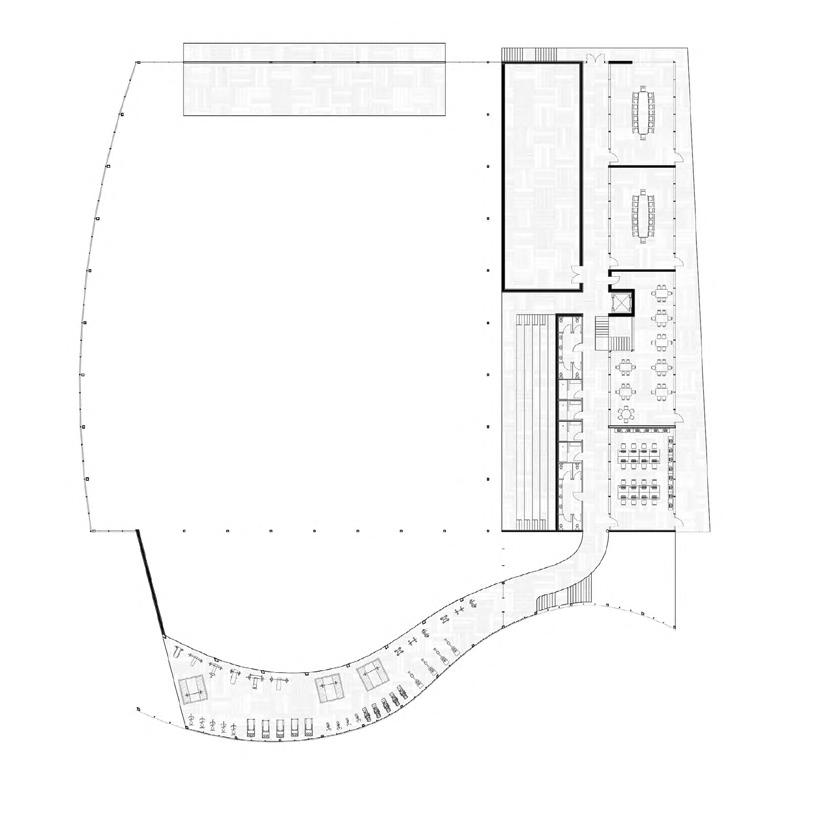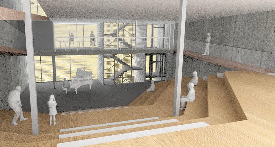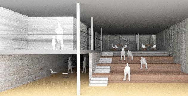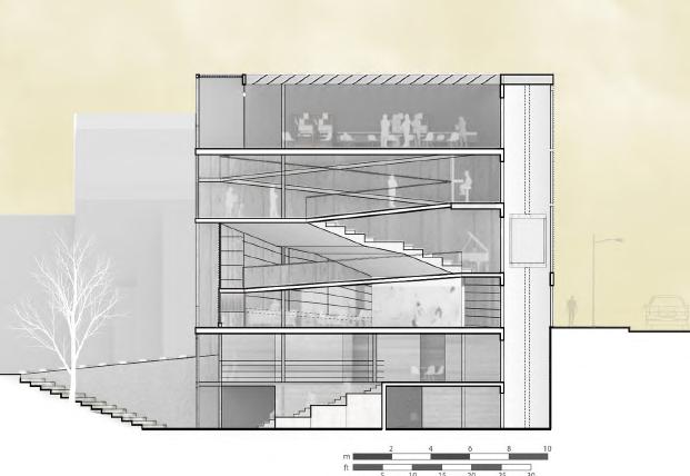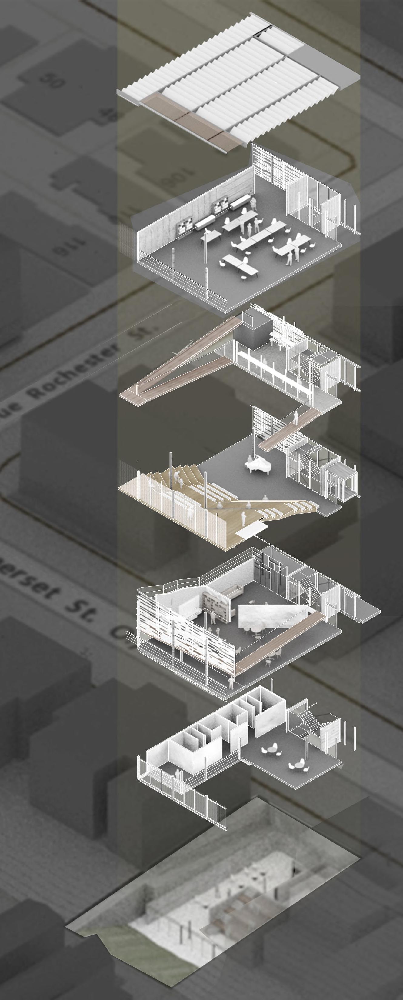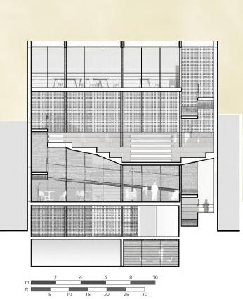 To accommodate the desired program without disrupting the the low-rise character of the neighborhood, the spatial scheme descends two levels from the street level to an underground level. Also, the main circulation space consists of a series of ramps that articulate a continuous journey throughout the different platforms of the building.