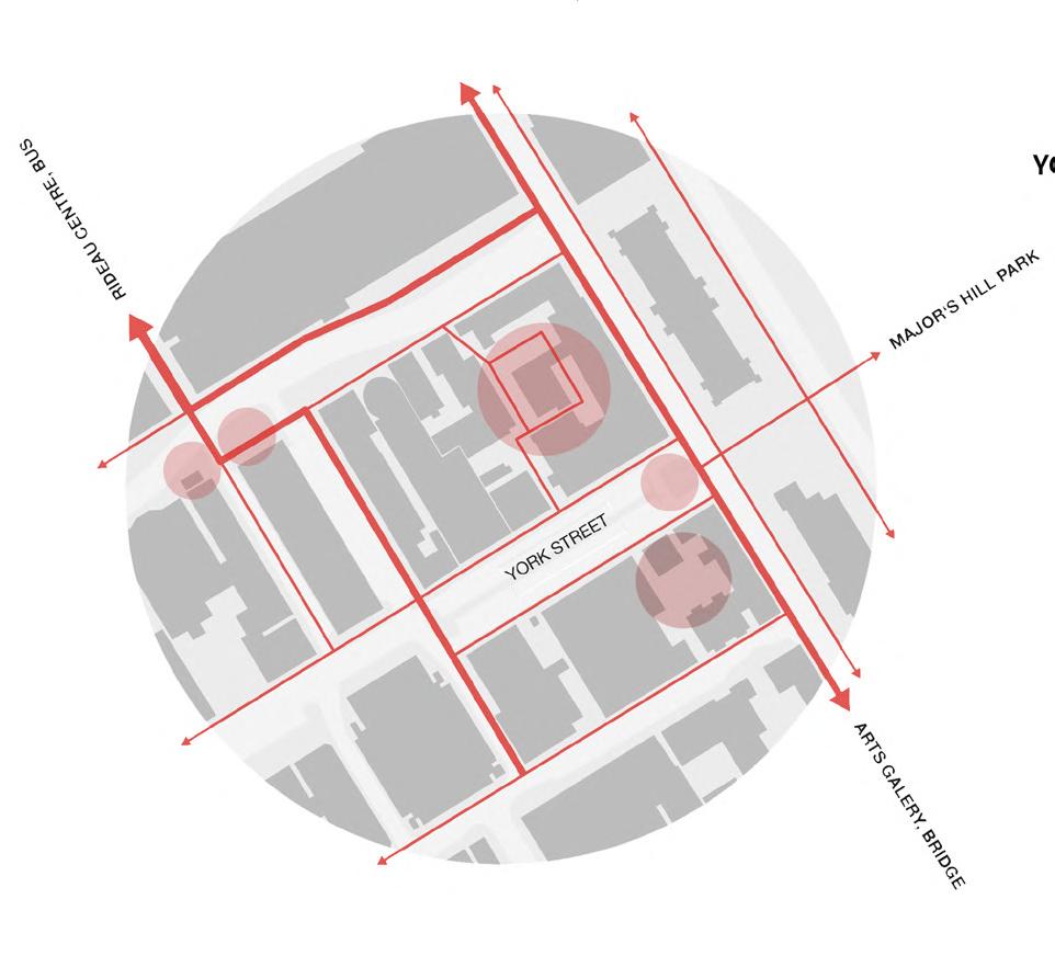 The street parking lot at York Street in the Byward market presents an under-utilized urban space. The presented alternative demonstates an iniciative to help abutting businesses by removing the existing parking lot in order to create an outdoor living room. The purpose of the design is to bring more pedestrian activity to the area. The distinct wooden plattforms create a space that is neutral and flexible enough to support a range of different activities and events while providing a place for contemplation when its largely vacant.