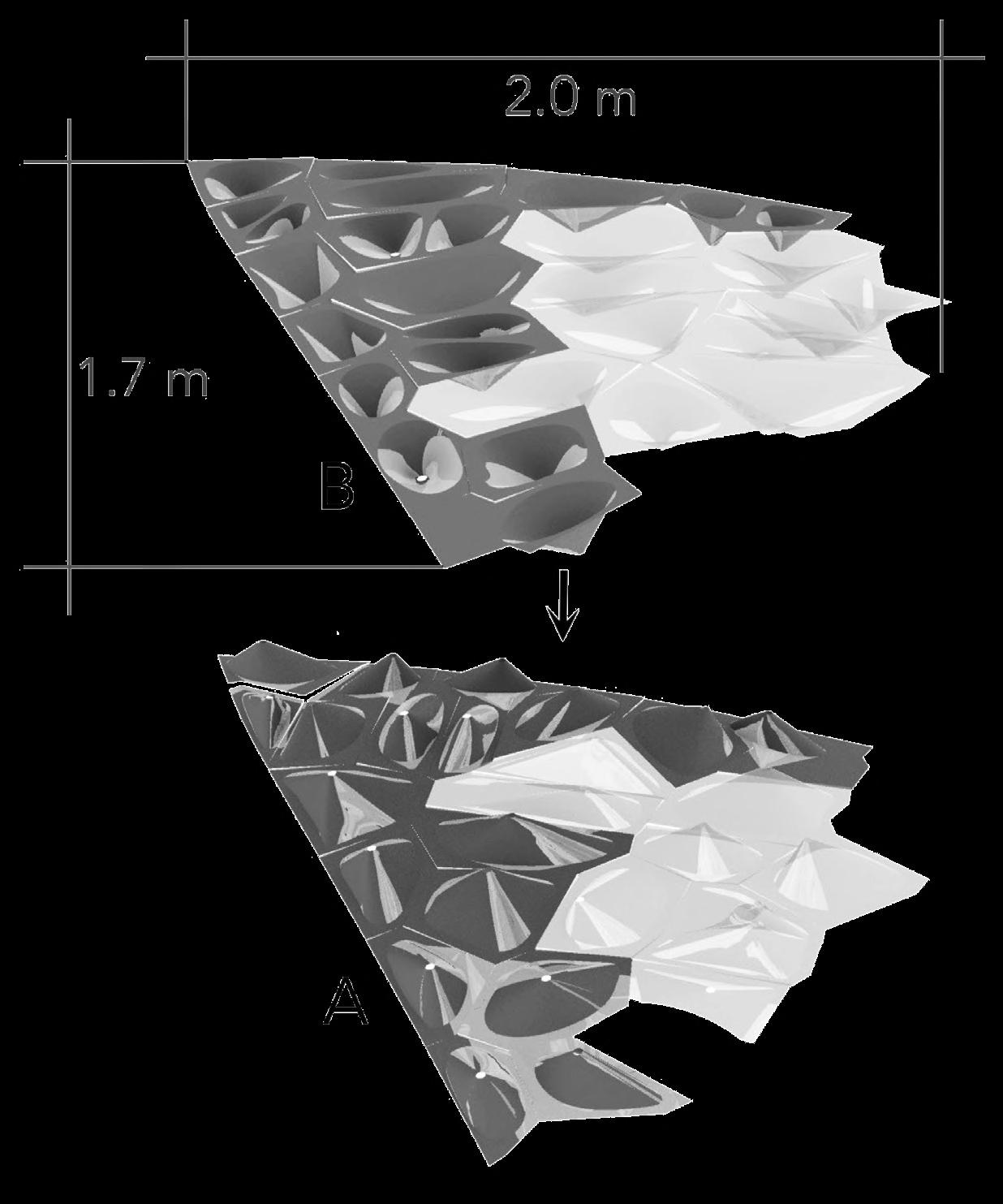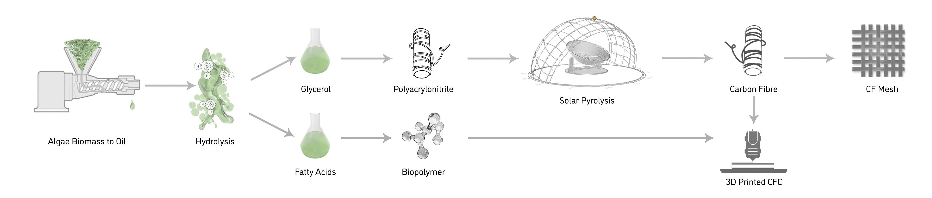Phase III catenary shell typologies are programmed as material laboratories for the production of carbon-negative carbon-fibre reinforced polymers from algaeic biomass. The process consists on splitting the mass into polyacrylonitrile fibers and glycerol. The fibers are carbonized via parabolic solar reflectors to obtain carbon fibre, and glycerol is converted into a polymer resin.