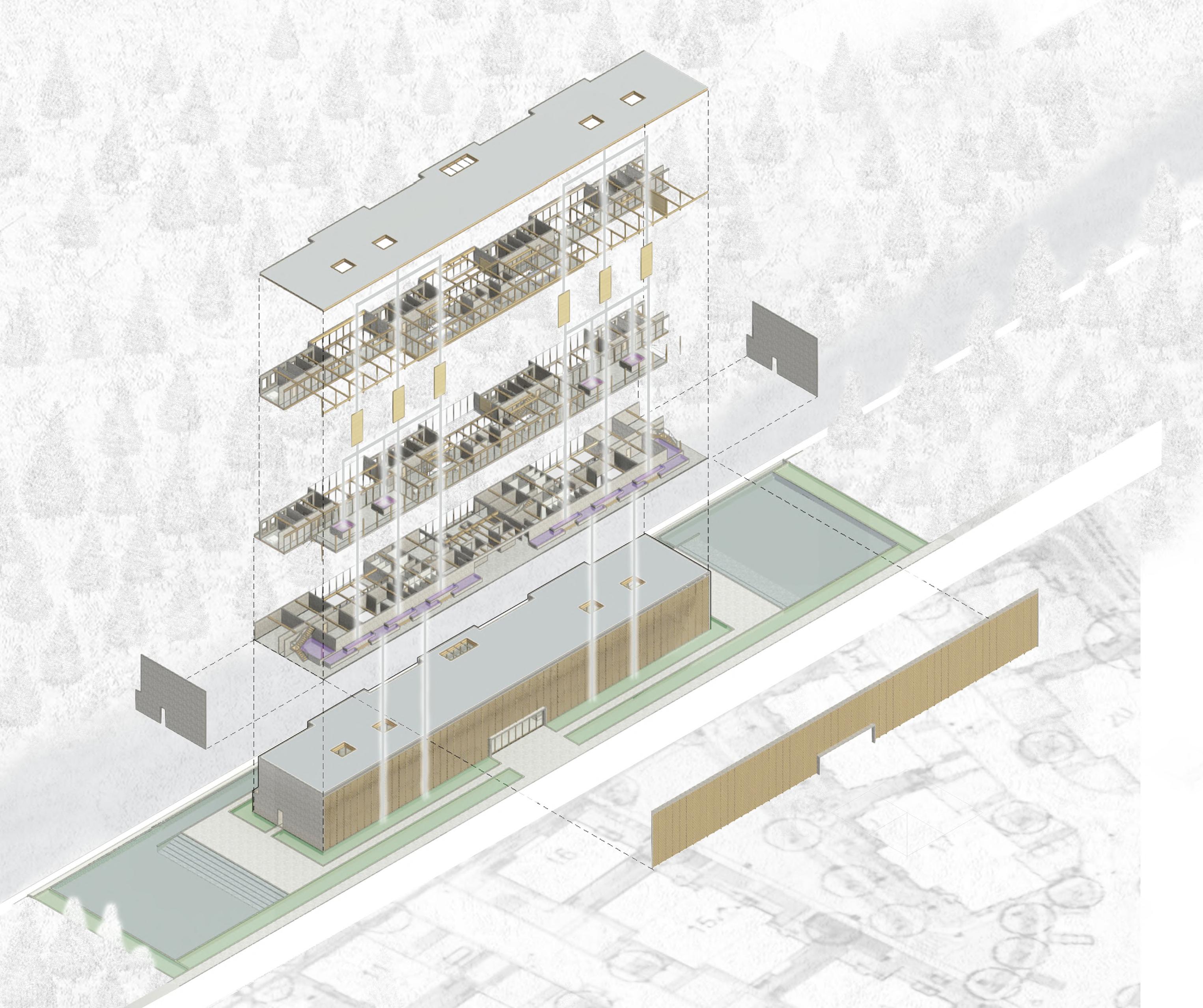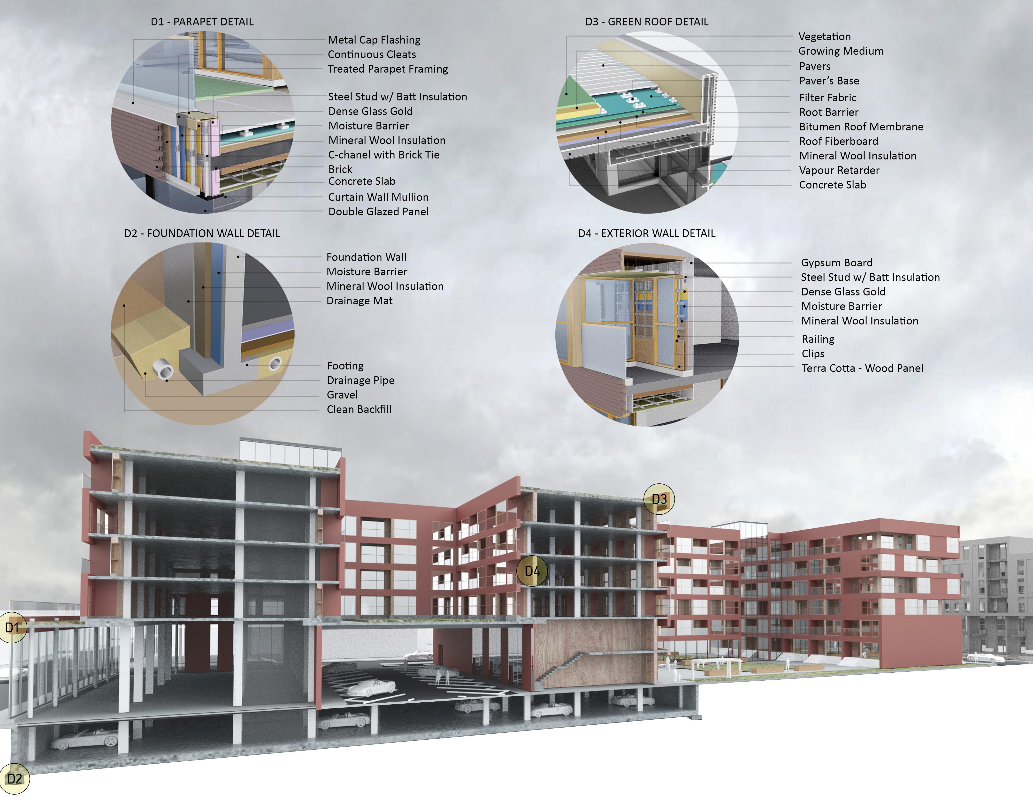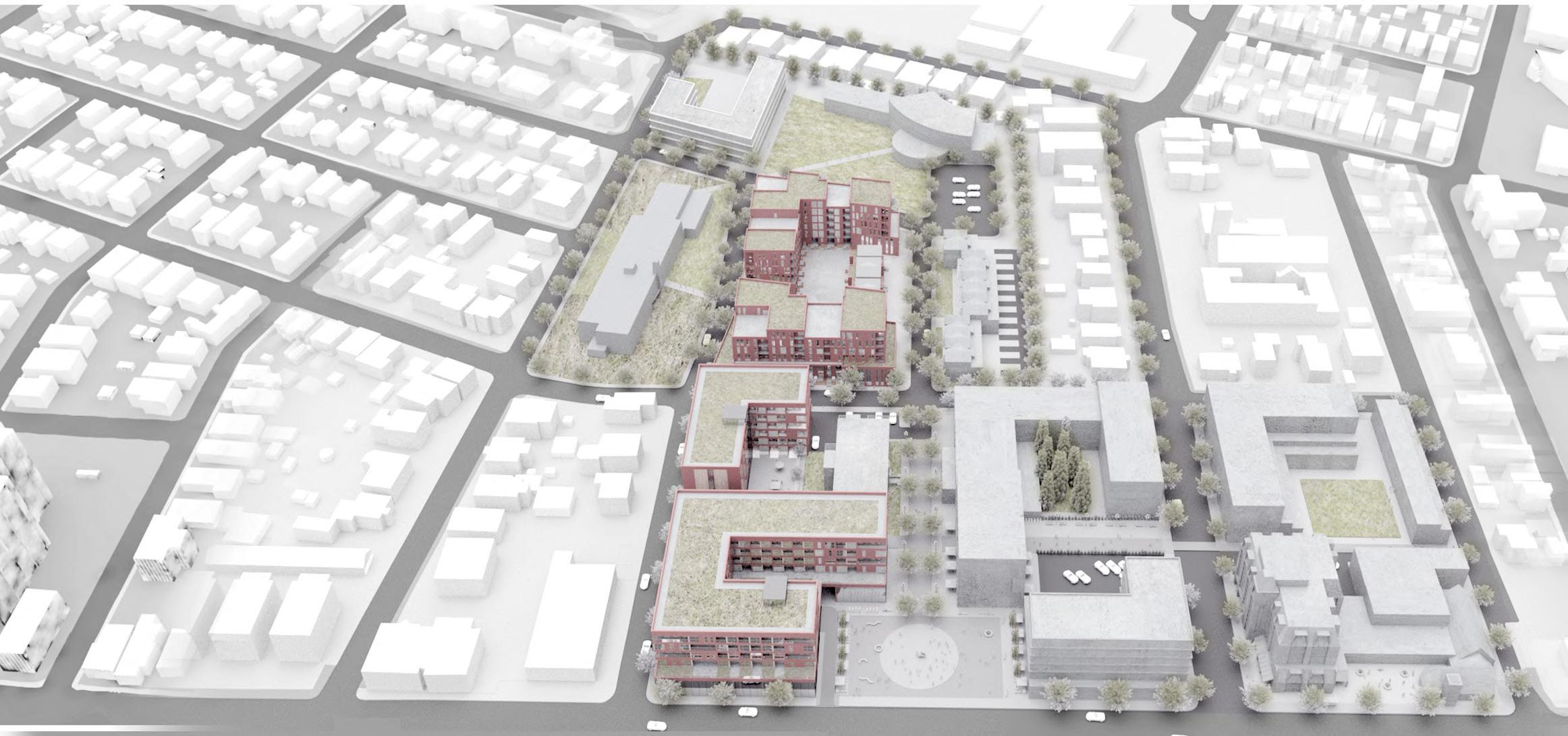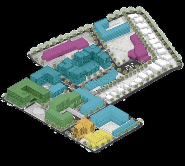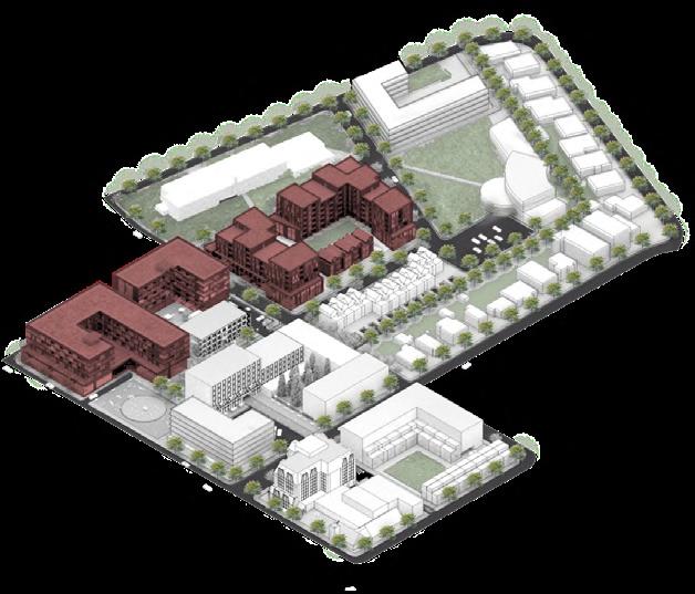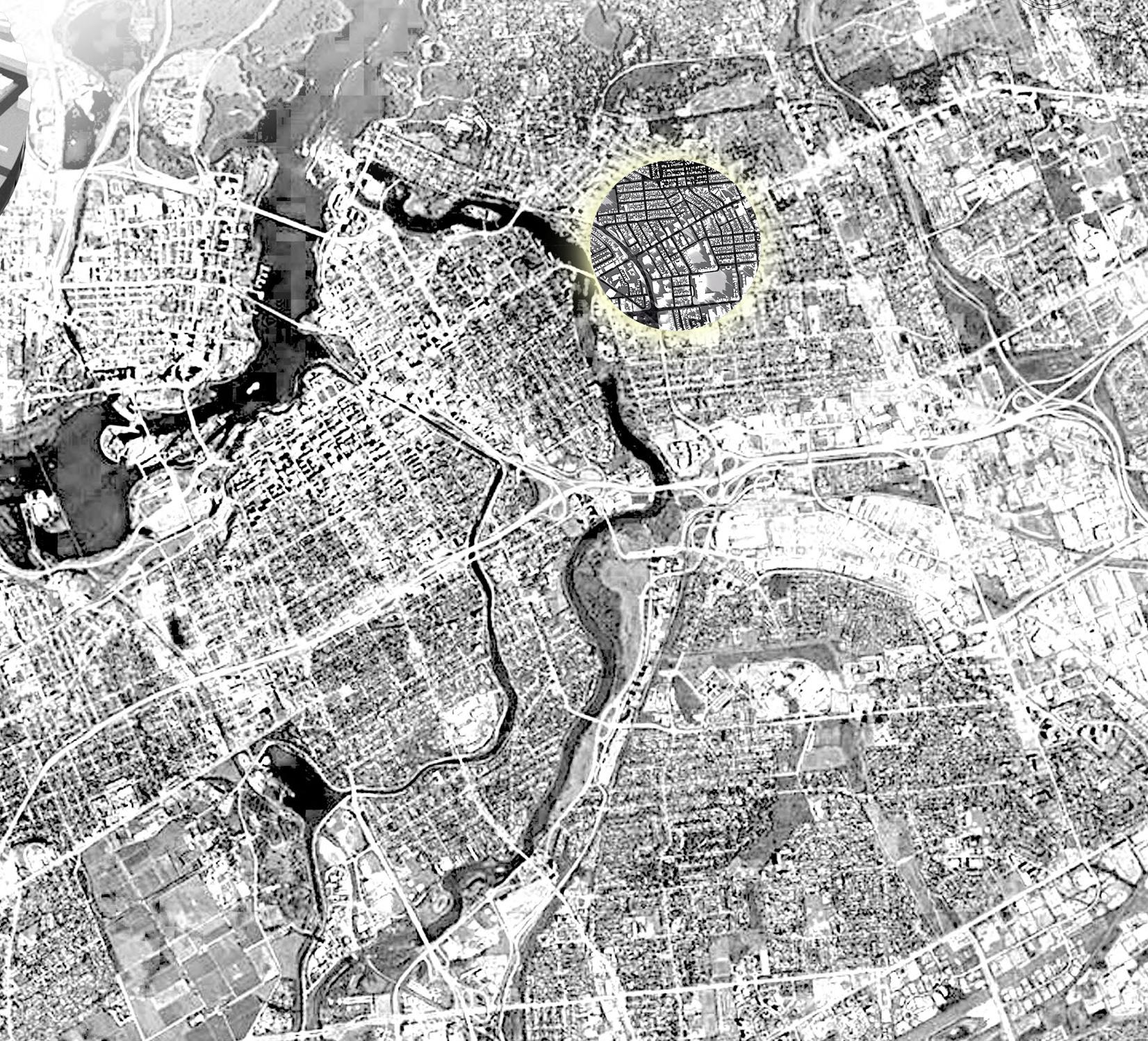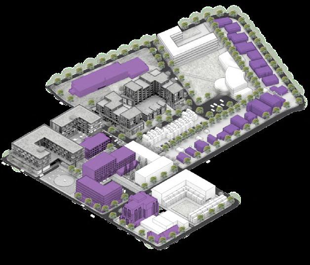 Institutional buildings & commercial programmes blend with the residential schemes to orchestrate a new district that strives to revitalize the urban dynamcs of Vanier’s neighbourhood.