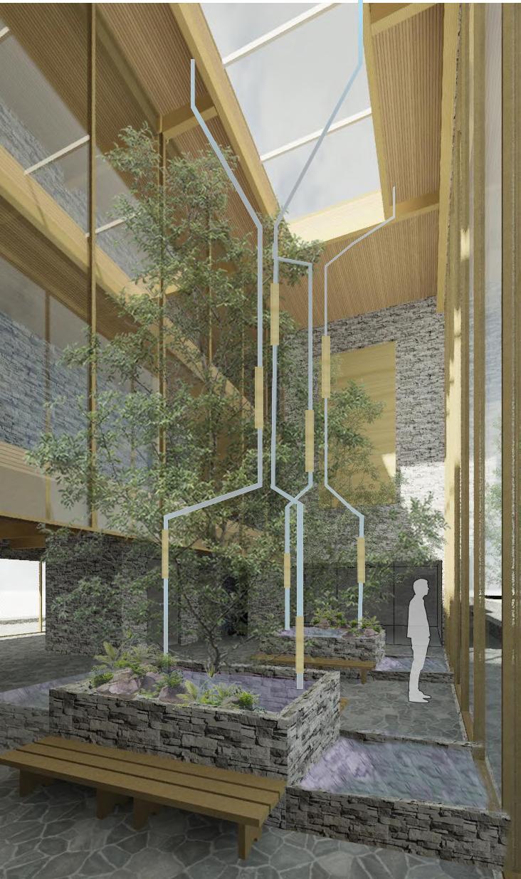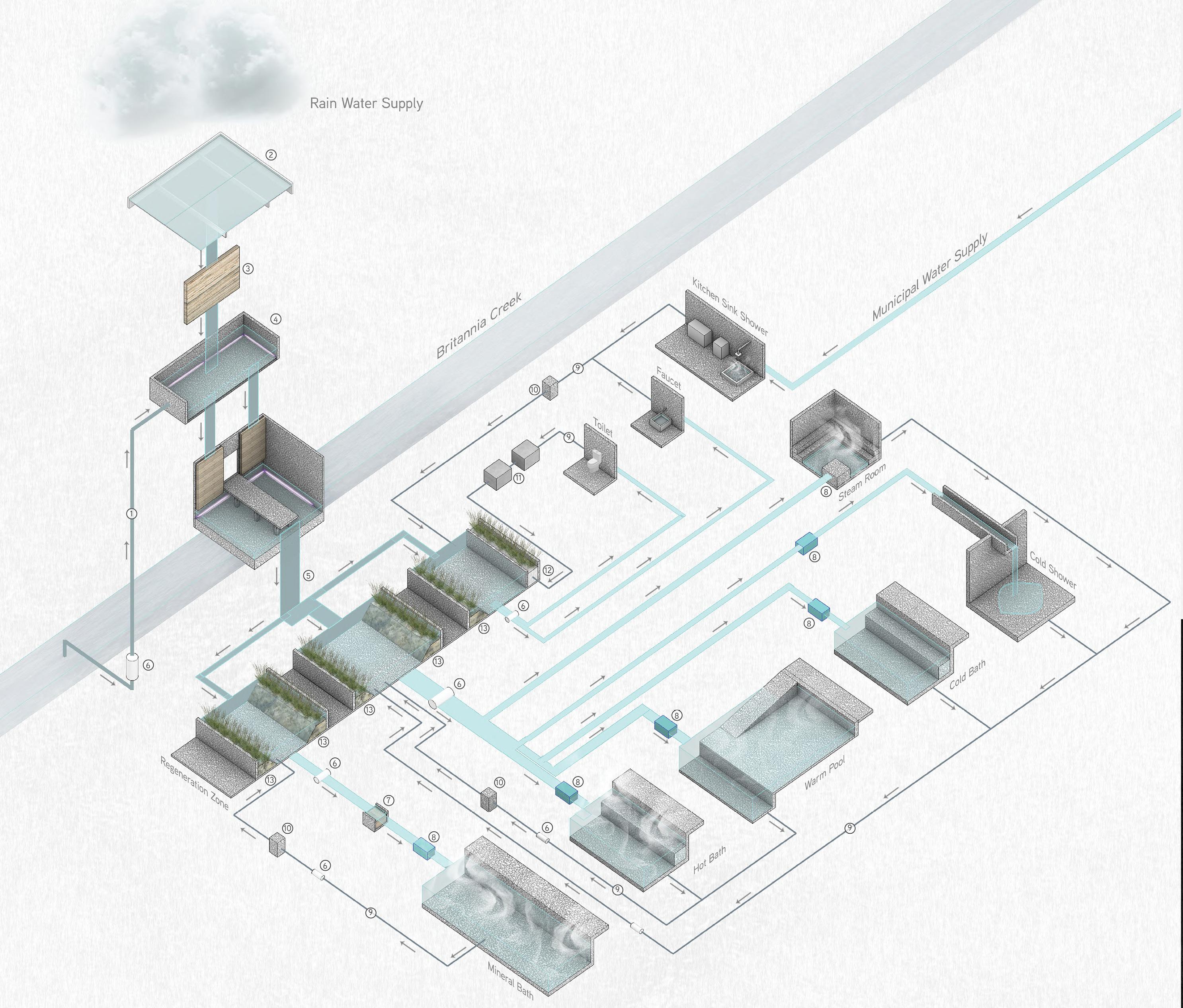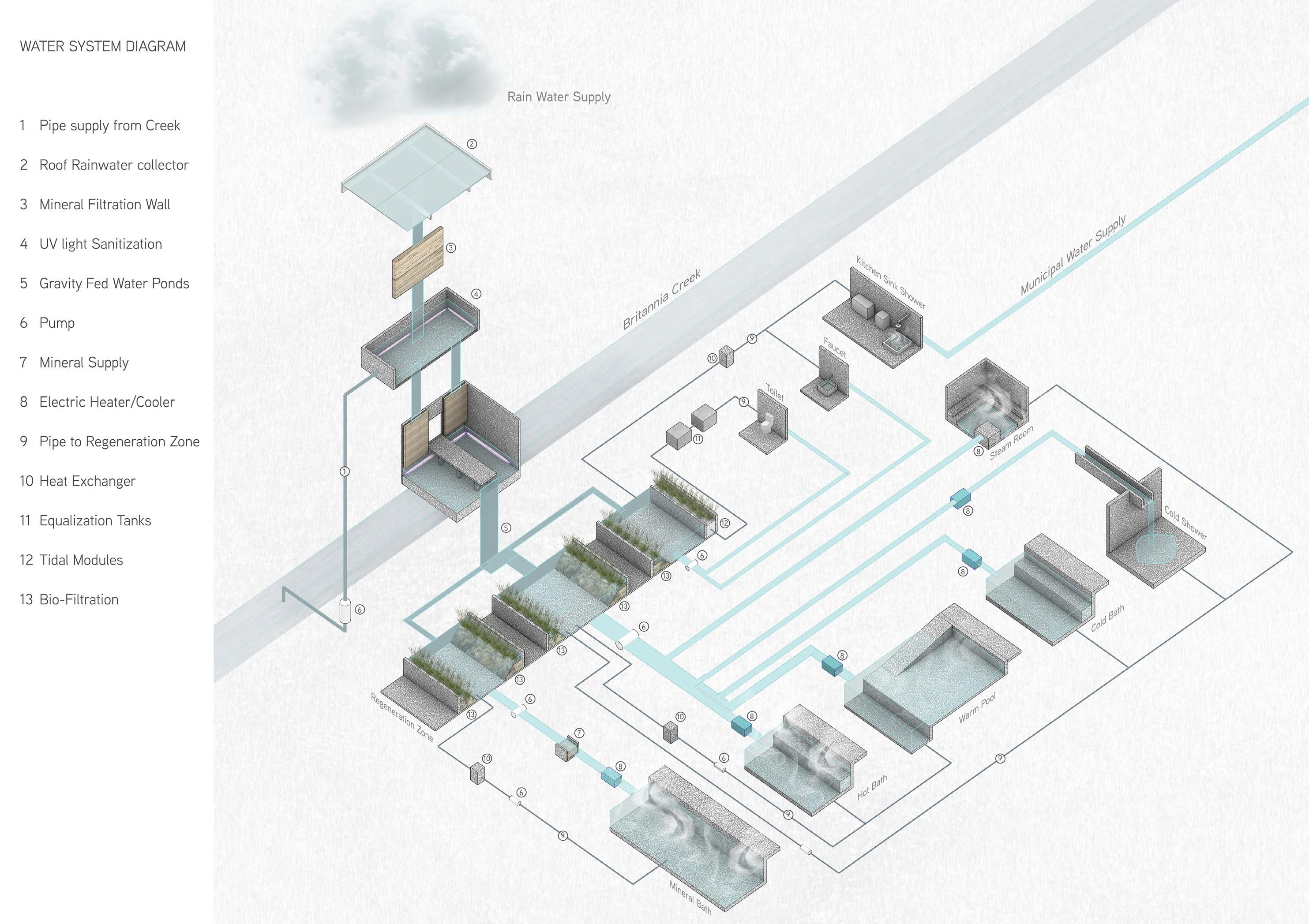 The proposed design aims to carry on efforts to safeguard the ecosystem’s hydrology through the implementation of environmentally concious strategies while elevating water as the main experiential element for guests + the surrounding community.