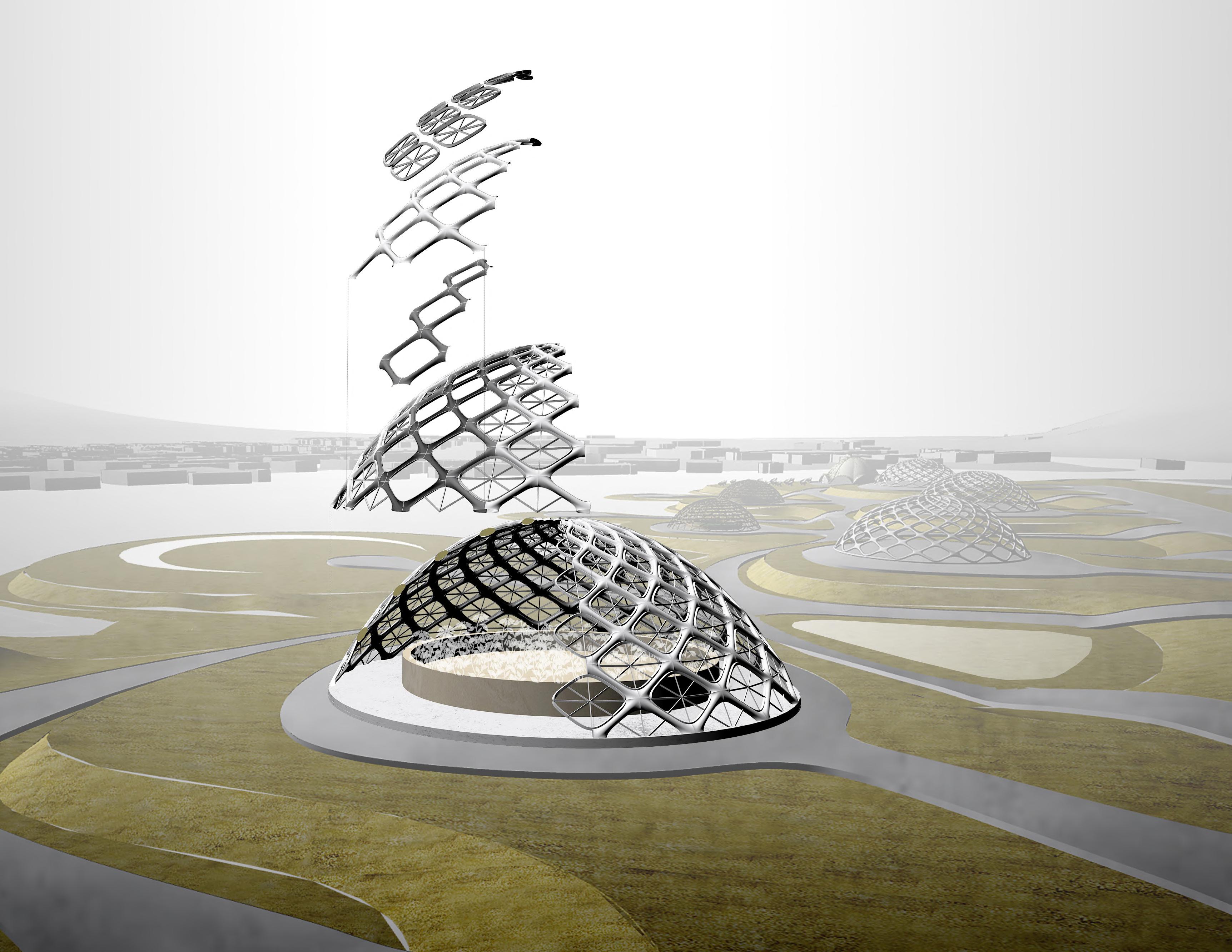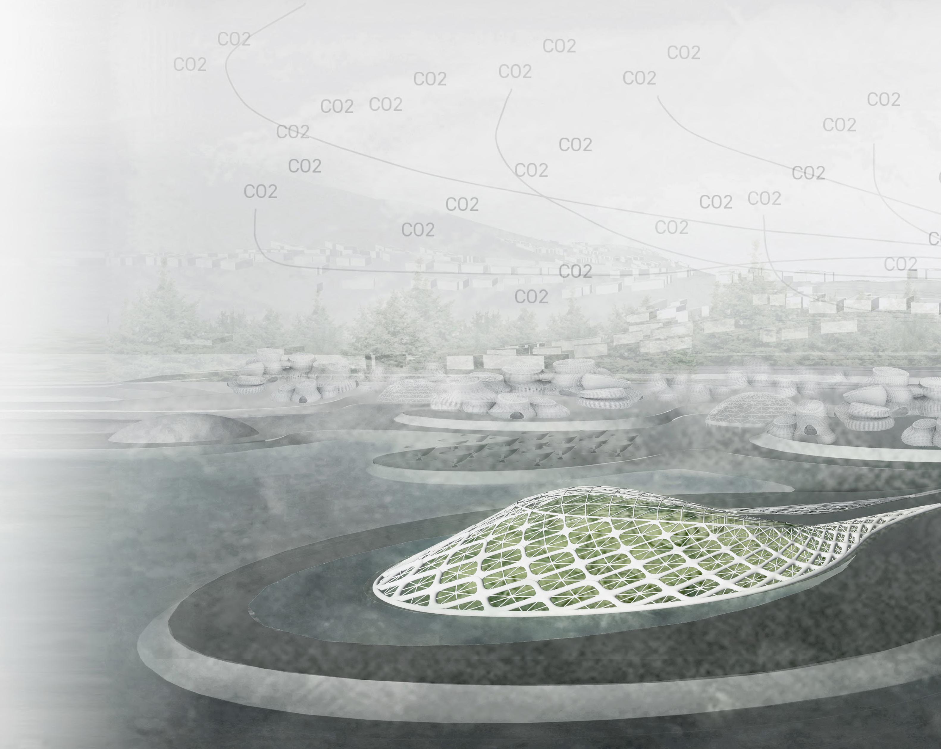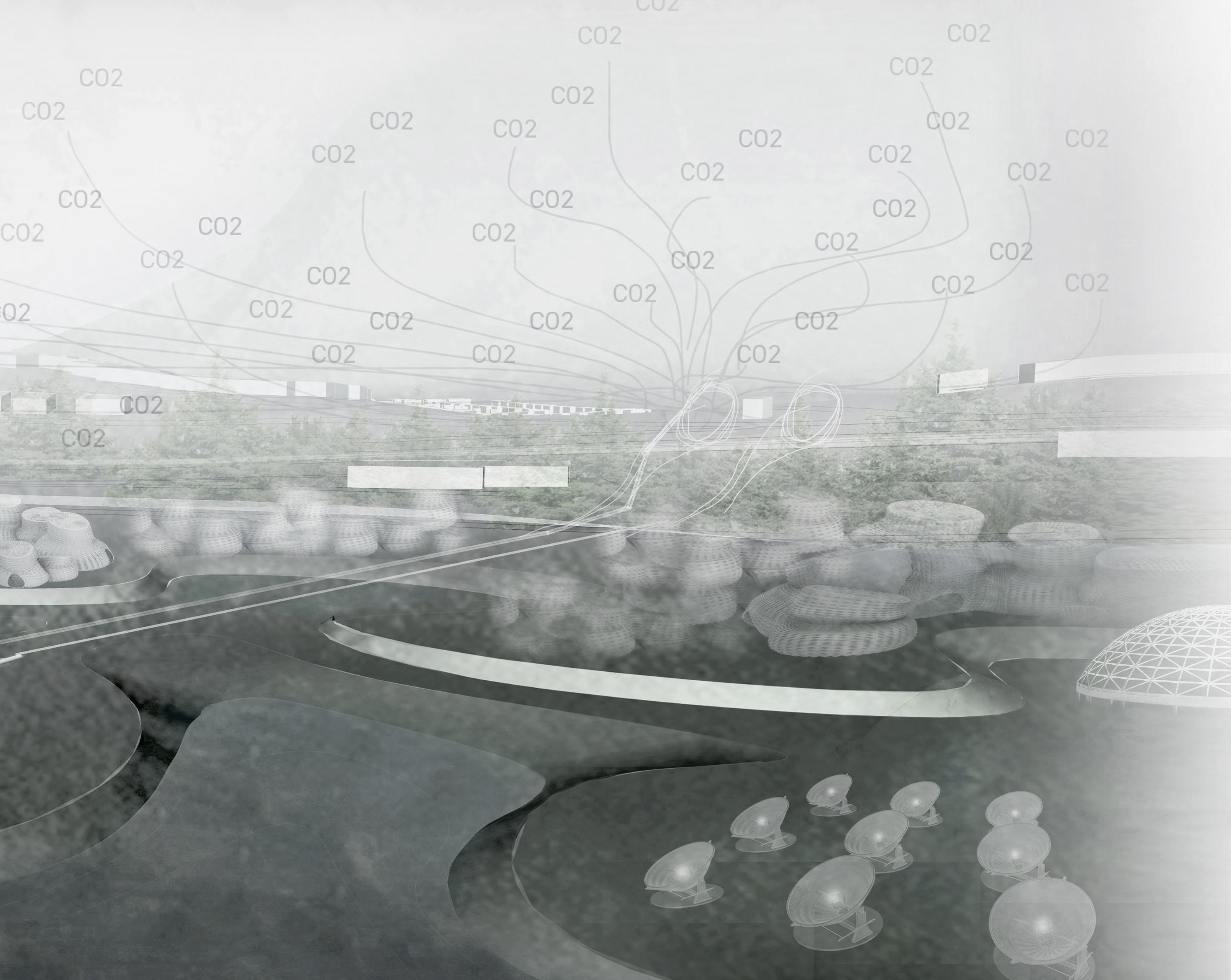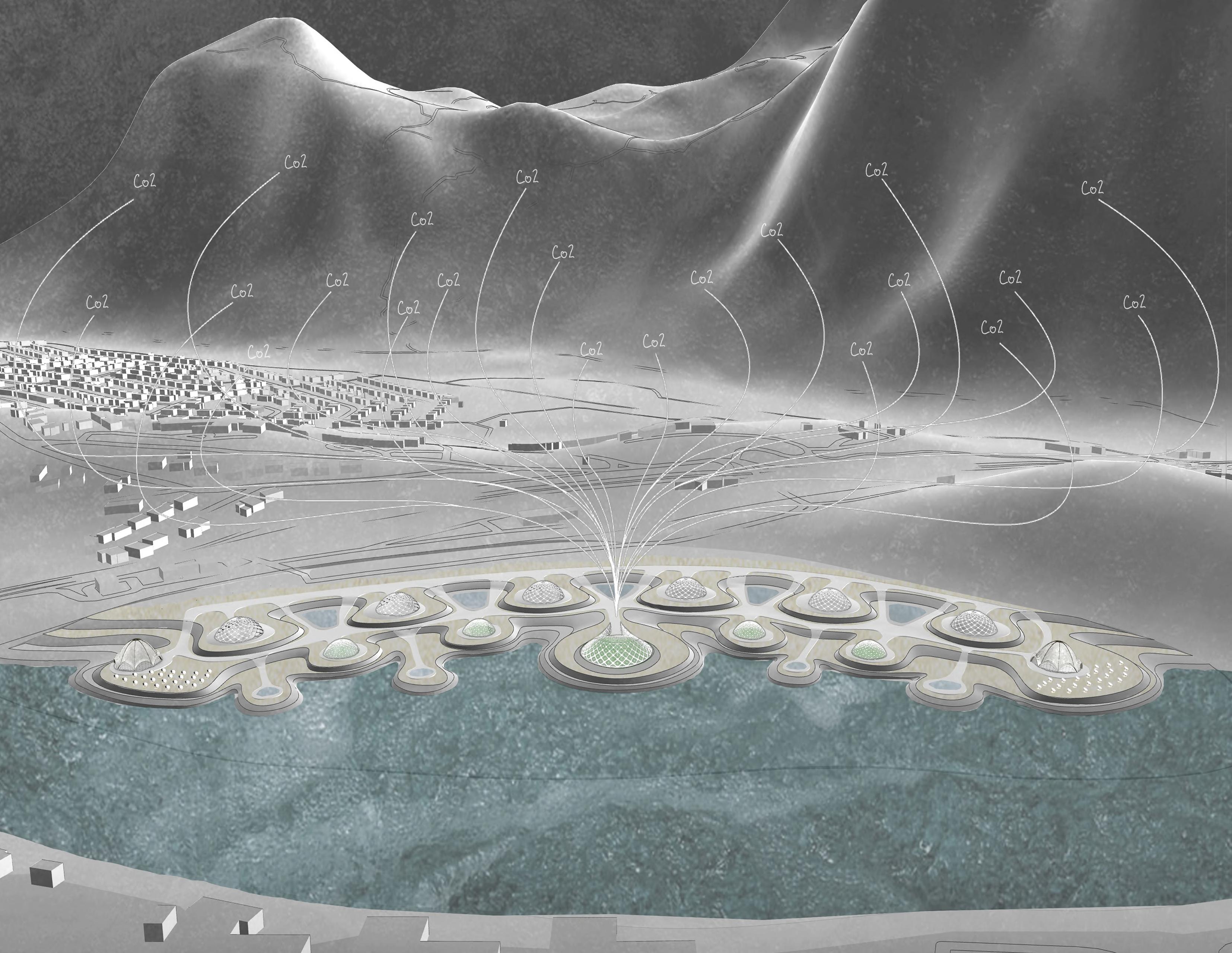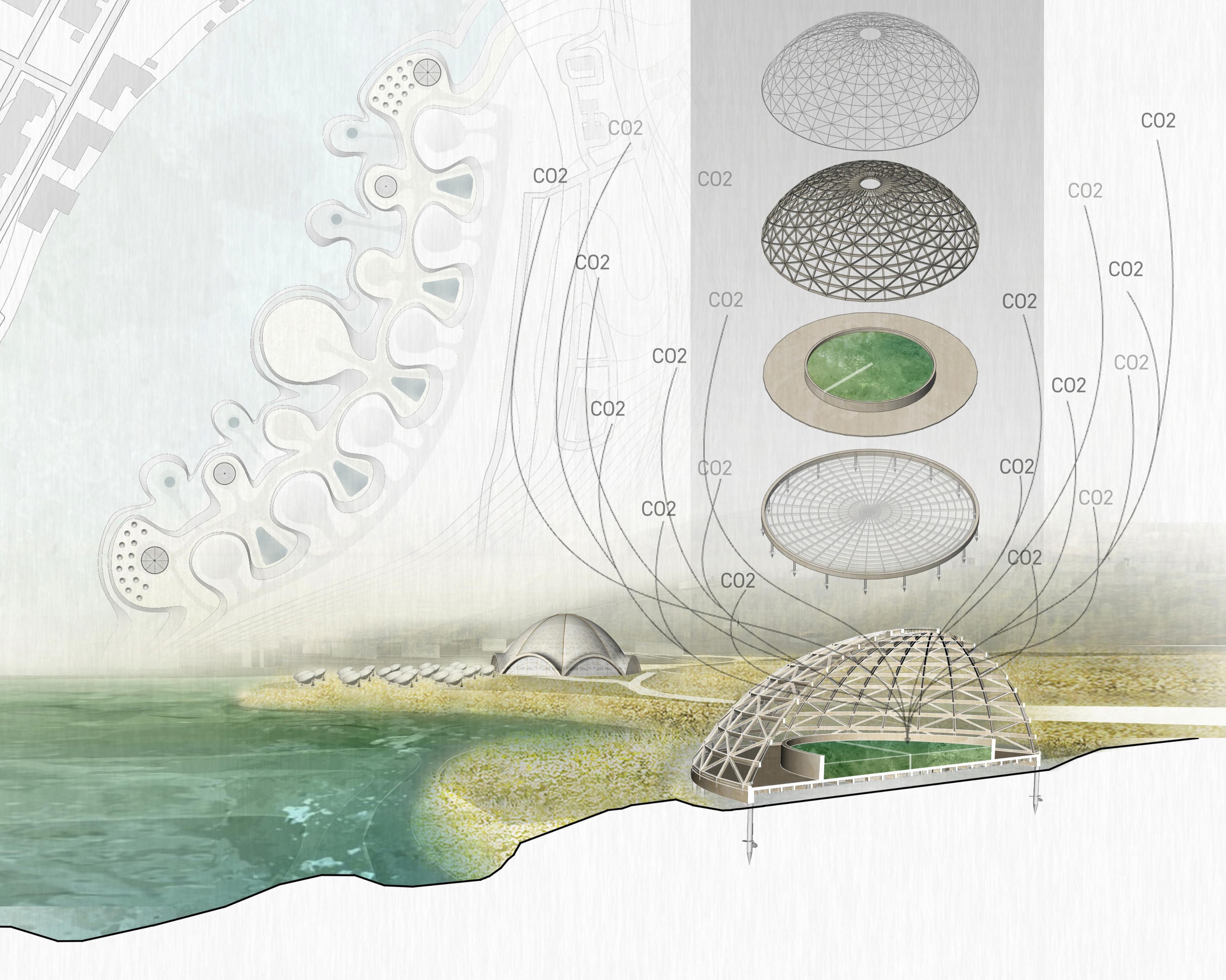 At the ground of the domes, enclosed ponds act as closedloop deposition tanks that allow for algae biomass extraction, thereby producing a carbon-negative renewable material.