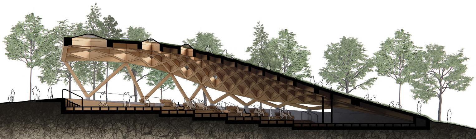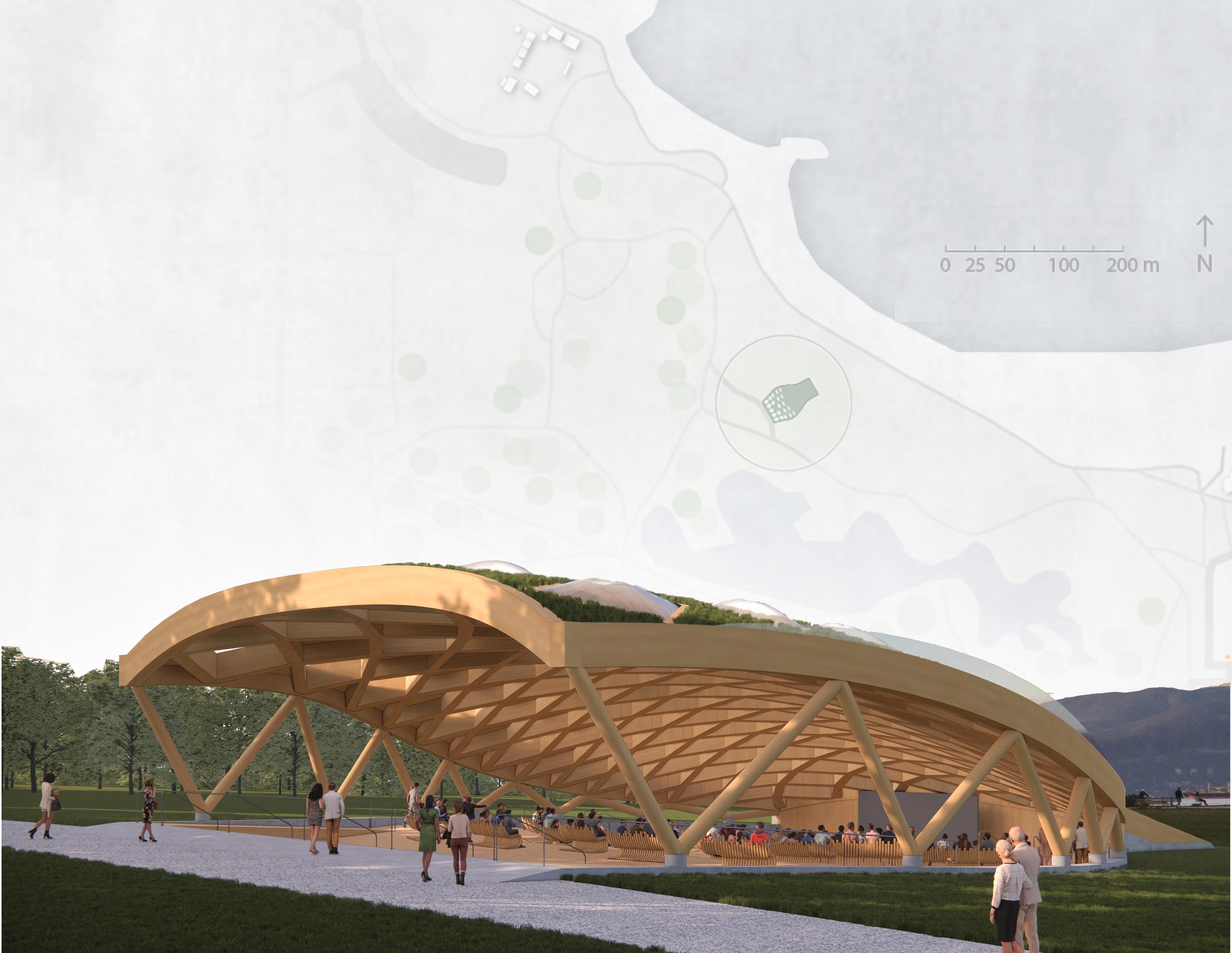 Our primary intent for the Jericho Beach outdoor cinema is to create an emblematic space that celebrates the natural and cultural richness of its location. We answered this design challenge by thinking about how the purpose of the theater could be extended beyond its initial function: we tried to create an experience for moviegoers but also for all park visitors at large. Thus, we are proposing to house the theater under a green roof structure that is directly accessible from the ground, allowing people to climb on it to sit and enjoy the ocean view.
